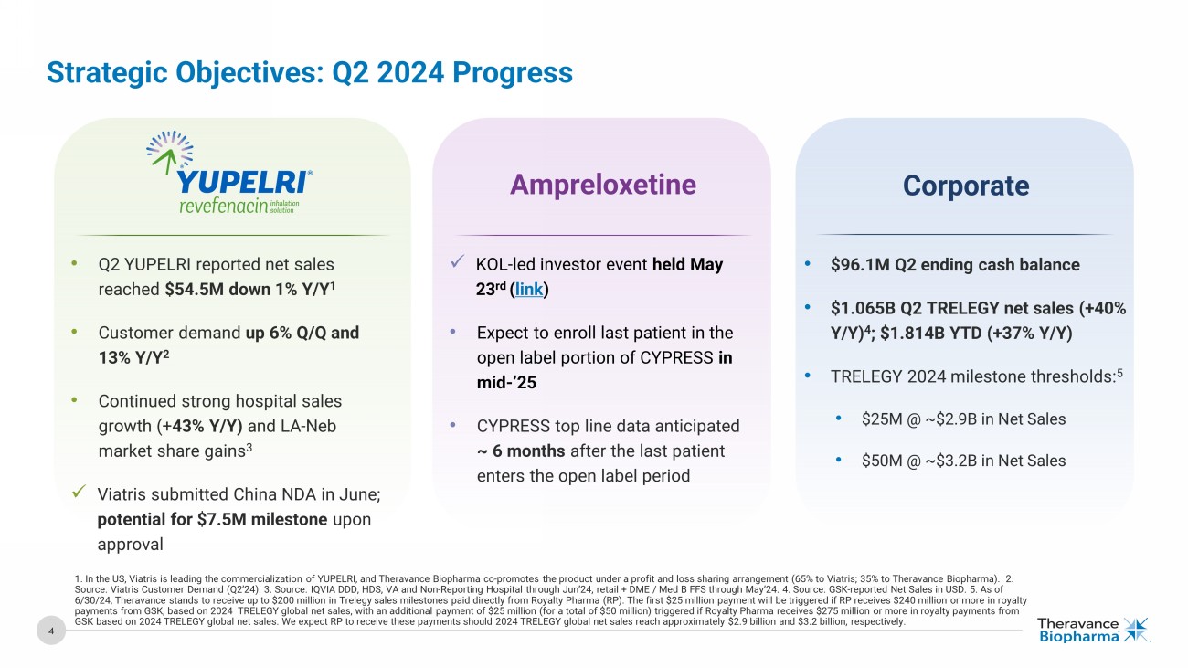 “YUPELRI net sales decreased 1% from the prior quarter, owing to near-term headwinds from an evolved channel mix and a lower realized net price,” said Rick Winningham, Theravance Biopharma CEO. “We are disappointed with this quarter’s net sales result, but remain confident in our ability to continue to grow YUPELRI in the future, given strong and consistent demand generation.” He continued, “In addition, while we have activated over 80% of study sites in CYPRESS and achieved solid enrollment in the quarter, we now anticipate enrolling the last patient into the open-label portion of the study in mid-2025. We continue to prioritize delivering a high-quality study in pursuit of making ampreloxetine available to those MSA patients suffering without viable treatment options for their symptomatic nOH. Finally, we are pleased with another exceptional quarter for TRELEGY, which increases our confidence in achieving milestones in 2024, which would contribute to our existing balance sheet strength.”