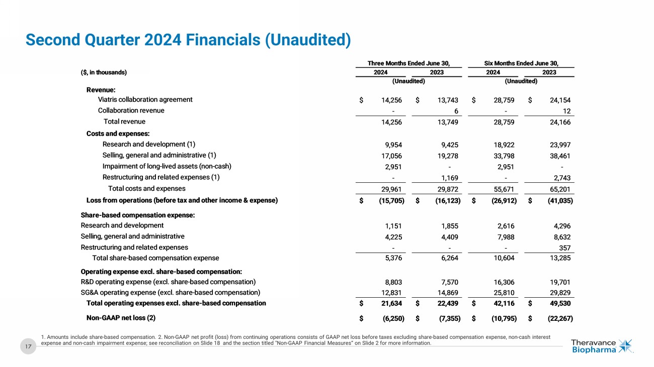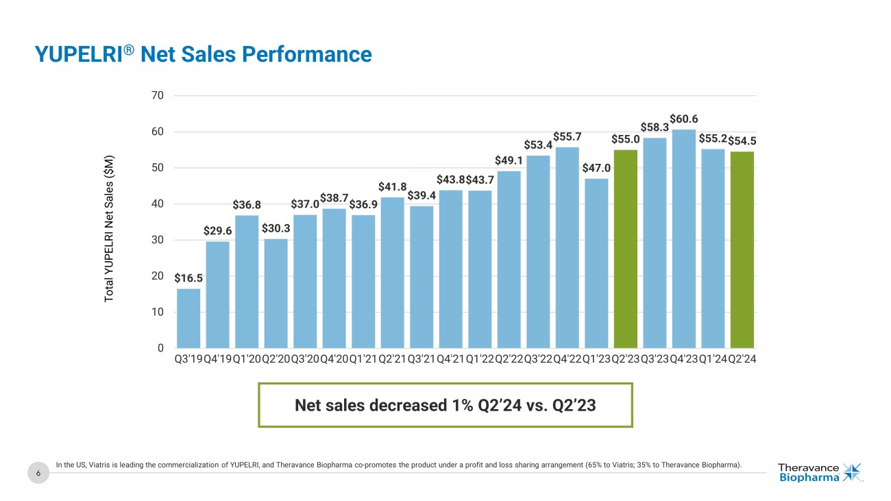 | · | Revenue: Total revenue for the second quarter of 2024 was $14.3 million, consisting entirely of Viatris collaboration revenue. Viatris collaboration revenue increased by $0.5 million, or 4%, in the second quarter compared to the same period in 2023 due primarily to lower costs incurred by Viatris. The Viatris collaboration revenue represents amounts receivable from Viatris and comprises the Company’s 35% share of net sales of YUPELRI, as well as its proportionate amount of the total shared costs incurred by the two companies. The non-shared YUPELRI costs incurred by Theravance Biopharma are recorded within operating expenses. While Viatris records the total net sales of YUPELRI within its financial statements, Theravance Biopharma’s implied 35% share of net sales of YUPELRI for the second quarter of 2024 was $19.1 million which represented a 1% decrease compared to the same period in 2023. |