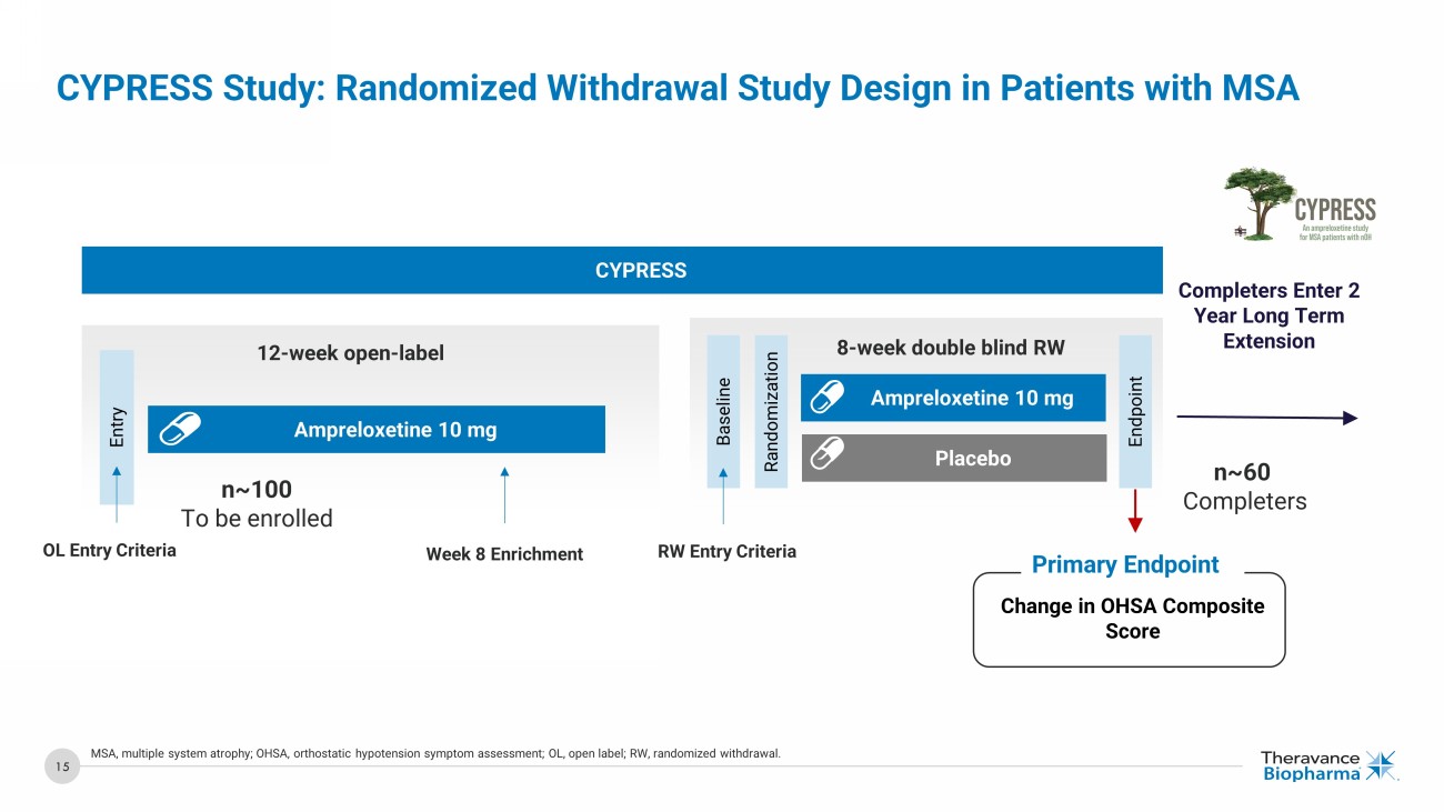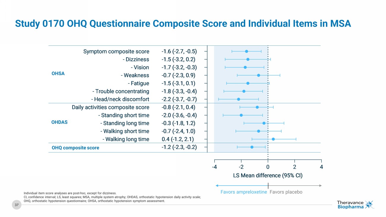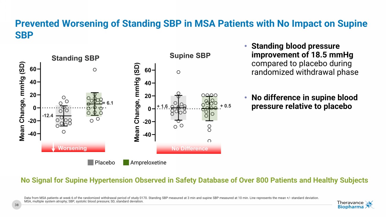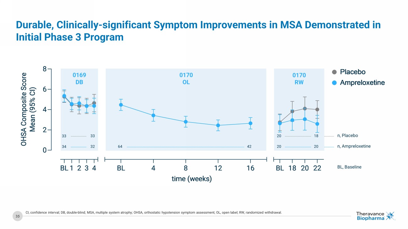 Study 0197 (NCT05696717) is currently enrolling. This is a registrational Phase 3, multi-center, randomized withdrawal study to evaluate the efficacy and durability of ampreloxetine in participants with MSA and symptomatic nOH after 20 weeks of treatment; the primary endpoint of the study is change in the Orthostatic Hypotension Symptom Assessment (OHSA) composite score. The Study includes four periods: screening, open label (12-week period, participants will receive a single daily 10 mg dose of ampreloxetine), randomized withdrawal (eight-week period, double-blind, placebo-controlled, participants will receive a single daily 10 mg dose of placebo or ampreloxetine), and a long-term treatment extension. Secondary outcome measures include change from baseline in Orthostatic Hypotension Daily Activity Scale (OHDAS) item 1 (activities that require standing for a short time) and item 3 (activities that require walking for a short time).