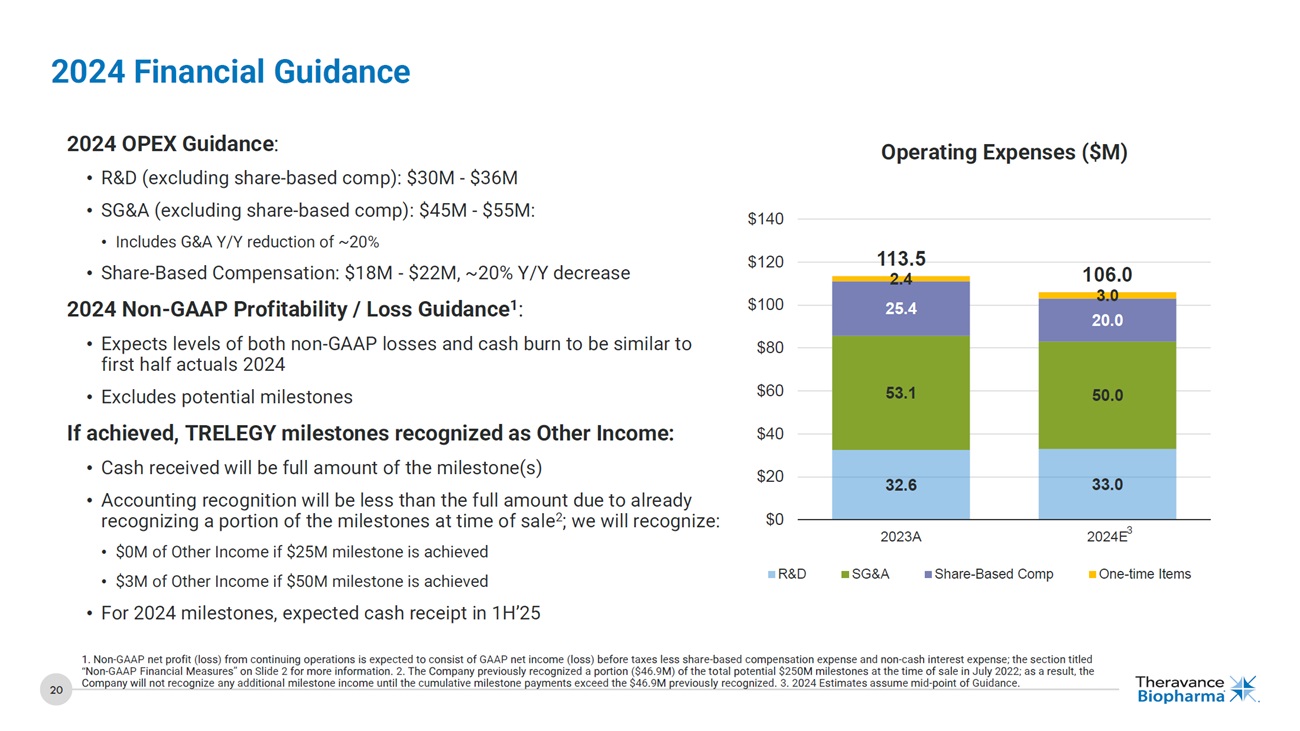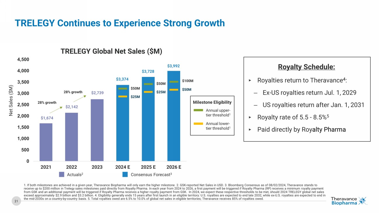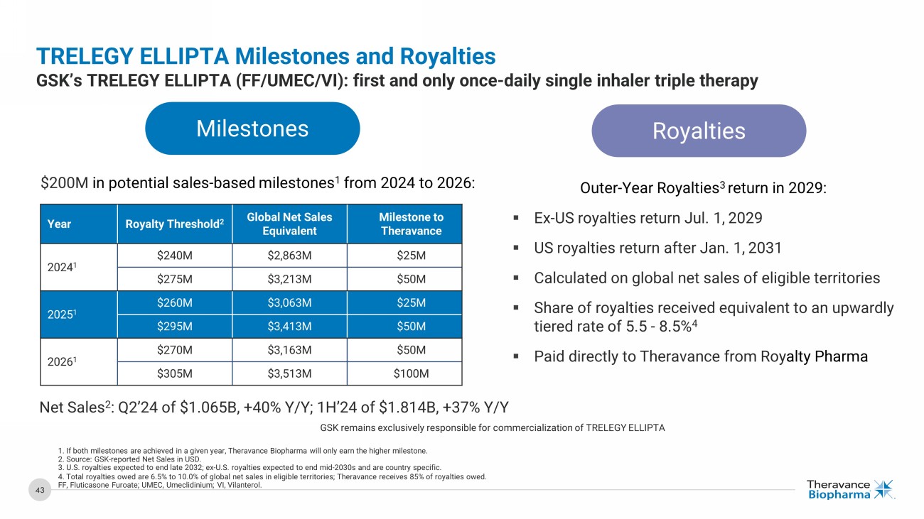 | · | As of June 30, 2024, Theravance Biopharma is eligible to receive a total of $200 million in milestone payments from Royalty Pharma, should TRELEGY achieve certain sales thresholds. The next milestone payment of $25 million will be achieved if TRELEGY global net sales reach approximately $2.9 billion in 2024 (requiring second half 2024 sales of approximately $1.1 billion), and a second $25 million milestone payment (for a total of $50 million) will be achieved if TRELEGY global net sales exceed approximately $3.2 billion in 2024 (requiring second half 2024 sales of approximately $1.4 billion). |