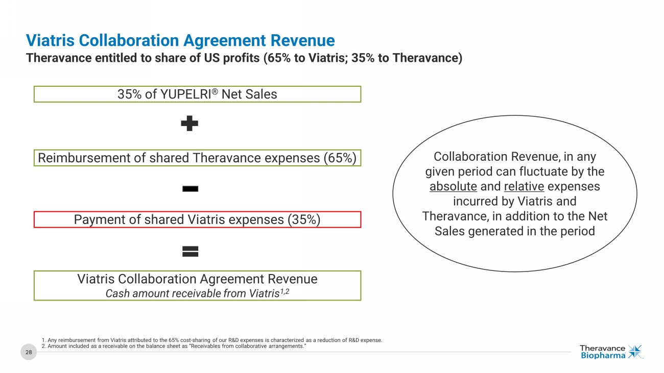 1 In the US, Viatris is leading the commercialization of YUPELRI, and the Company co-promotes the product under a profit and loss sharing arrangement (65% to Viatris; 35% to the Company).