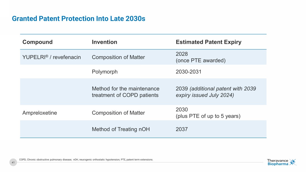 An additional method of use patent for YUPELRI was granted on July 30, 2024, which expires in August 2039, and is listed in the FDA Orange Book.