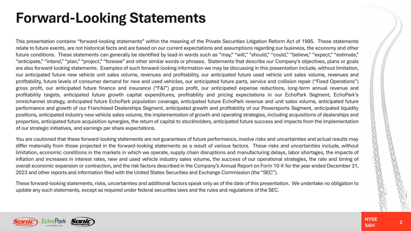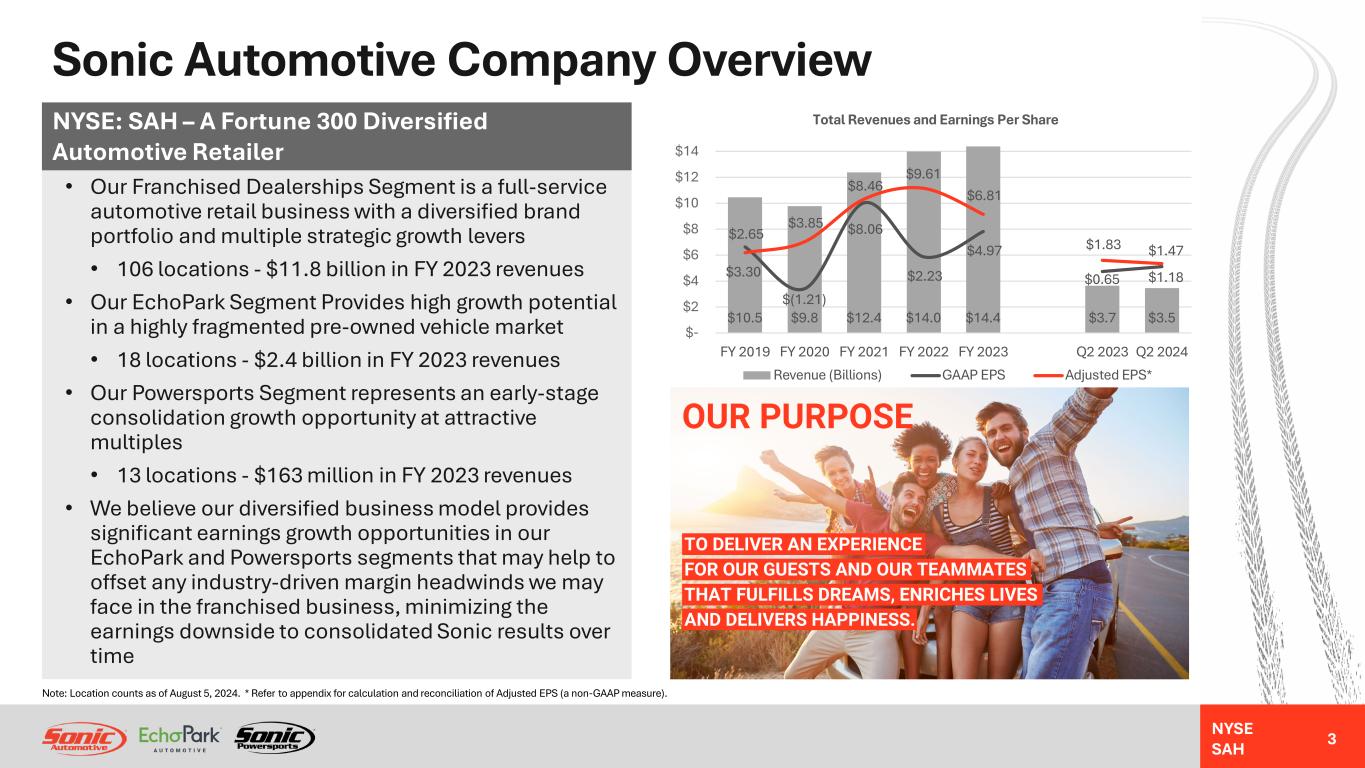 NYSE SAH Forward-Looking Statements This presentation contains “forward-looking statements” within the meaning of the Private Securities Litigation Reform Act of 1995. These statements relate to future events, are not historical facts and are based on our current expectations and assumptions regarding our business, the economy and other future conditions. These statements can generally be identified by lead-in words such as “may,” “will,” “should,” “could,” “believe,” “expect,” “estimate,” “anticipate,” “intend,” “plan,” “project,” “foresee” and other similar words or phrases. Statements that describe our Company’s objectives, plans or goals are also forward-looking statements. Examples of such forward-looking information we may be discussing in this presentation include, without limitation, our anticipated future new vehicle unit sales volume, revenues and profitability, our anticipated future used vehicle unit sales volume, revenues and profitability, future levels of consumer demand for new and used vehicles, our anticipated future parts, service and collision repair (“Fixed Operations”) gross profit, our anticipated future finance and insurance (“F&I”) gross profit, our anticipated expense reductions, long-term annual revenue and profitability targets, anticipated future growth capital expenditures, profitability and pricing expectations in our EchoPark Segment, EchoPark’s omnichannel strategy, anticipated future EchoPark population coverage, anticipated future EchoPark revenue and unit sales volume, anticipated future performance and growth of our Franchised Dealerships Segment, anticipated growth and profitability of our Powersports Segment, anticipated liquidity positions, anticipated industry new vehicle sales volume, the implementation of growth and operating strategies, including acquisitions of dealerships and properties, anticipated future acquisition synergies, the return of capital to stockholders, anticipated future success and impacts from the implementation of our strategic initiatives, and earnings per share expectations. You are cautioned that these forward-looking statements are not guarantees of future performance, involve risks and uncertainties and actual results may differ materially from those projected in the forward-looking statements as a result of various factors. These risks and uncertainties include, without limitation, economic conditions in the markets in which we operate, supply chain disruptions and manufacturing delays, labor shortages, the impacts of inflation and increases in interest rates, new and used vehicle industry sales volume, the success of our operational strategies, the rate and timing of overall economic expansion or contraction, and the risk factors described in the Company’s Annual Report on Form 10-K for the year ended December 31, 2023 and other reports and information filed with the United States Securities and Exchange Commission (the “SEC”). These forward-looking statements, risks, uncertainties and additional factors speak only as of the date of this presentation. We undertake no obligation to update any such statements, except as required under federal securities laws and the rules and regulations of the SEC. 2