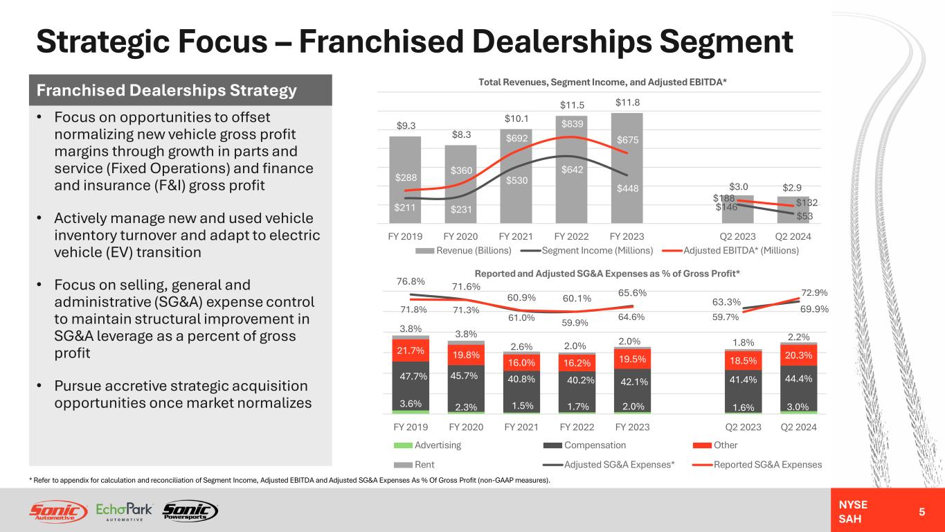 NYSE SAH Diversified Portfolio And Business Lines 4 Geographic Distribution TX 27% CA 23% CO 9% TN 7% FL 5% AL 5% NC 5% GA 4% ID 3% VA 2% MD 2% NV 2% All Others 6% Total Revenues By State Note: Percentages are percent of total for year ended December 31, 2023. 5% 30% 12% 39% 38% 7% 45% 24% Revenue Gross Profit New Vehicle Used Vehicle (Including Wholesale) Parts, Service & Collision Repair ("Fixed Operations") Finance & Insurance ("F&I") Category % of Revenue Franchised Brand % of Revenue BMW 21% Mercedes 11% Audi 6% Lexus 4% Porsche 3% Land Rover 3% Cadillac 2% Other Luxury (1) 3% Honda 9% Toyota 7% Other Import (2) 3% EchoPark 17% Non-Franchised 17% Chevrolet GMC Buick 4% Ford 4% Chrysler Dodge Jeep RAM 3% Powersports <1% Powersports (3) <1% Luxury 53% 19%Import Domestic 11% (1) Includes Alfa Romeo, Infiniti, Jaguar, Maserati, MINI and Volvo (2) Includes Hyundai, Nissan, Mazda, Subaru and Volkswagen (3) Includes Harley-Davidson, Kawasaki, BRP, Polaris, Honda, Suzuki, BMW Motorrad, Yamaha, Ducati, and Indian Motorcycle Business Line MixBrand Distribution