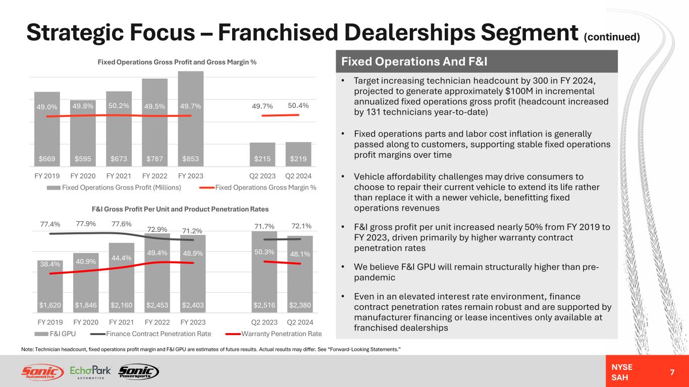 NYSE SAH Strategic Focus – Franchised Dealerships Segment (continued) 6 111.5 91.9 99.8 99.4 107.3 27.4 26.5 $42.9 $45.9 $49.9 $56.1 $57.9 $57.9 $57.7 $2,078 $2,536 $4,595 $6,591 $4,836 $5,003 $3,579 FY 2019 FY 2020 FY 2021 FY 2022 FY 2023 Q2 2023 Q2 2024 Retail New Vehicle Unit Sales Volume, Revenue, and Gross Profit Per Unit Unit Sales Volume (Thousands) Revenue Per Unit (Thousands) GPU 112.6 101.9 105.5 108.5 100.2 25.2 25.7 $22.1 $23.0 $27.5 $31.3 $30.4 $30.7 $28.5 $1,310 $1,207 $1,784 $1,607 $1,626 $1,765 $1,508 FY 2019 FY 2020 FY 2021 FY 2022 FY 2023 Q2 2023 Q2 2024 Retail Used Vehicle Unit Sales Volume, Revenue, and Gross Profit Per Unit Unit Sales Volume (Thousands) Revenue Per Unit (Thousands) GPU Retail New And Used Vehicles • While new vehicle GPUs continue to decline, we believe the "new normal" will be significantly higher than pre-pandemic levels • We believe used vehicle GPU may decline over time if we are able to drive higher retail used vehicle unit sales volume by supplementing our inventory levels from wholesale auction sources as off-rental inventory supply returns to normal • Strategic focus to return to selling at least 100 retail used vehicles per store per month, on average (represents approximately 25% improvement in retail used vehicle volume throughput per store) • As new and used vehicle sales volumes recover from pandemic-induced lows, F&I gross profit and fixed operations gross profit should benefit, partially offsetting vehicle gross margin normalization Note: New and used vehicle GPU, sales volume, and F&I and fixed operations gross profit expectations and projections are estimates of future results. Actual results may differ. See “Forward-Looking Statements.”