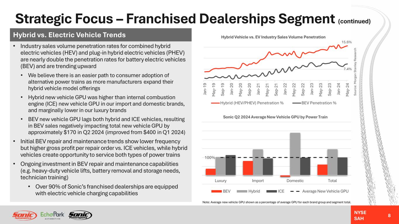 NYSE SAH Strategic Focus – Franchised Dealerships Segment (continued) 7 Fixed Operations And F&I • Target increasing technician headcount by 300 in FY 2024, projected to generate approximately $100M in incremental annualized fixed operations gross profit (headcount increased by 131 technicians year-to-date) • Fixed operations parts and labor cost inflation is generally passed along to customers, supporting stable fixed operations profit margins over time • Vehicle affordability challenges may drive consumers to choose to repair their current vehicle to extend its life rather than replace it with a newer vehicle, benefitting fixed operations revenues • F&I gross profit per unit increased nearly 50% from FY 2019 to FY 2023, driven primarily by higher warranty contract penetration rates • We believe F&I GPU will remain structurally higher than pre- pandemic • Even in an elevated interest rate environment, finance contract penetration rates remain robust and are supported by manufacturer financing or lease incentives only available at franchised dealerships $1,620 $1,846 $2,160 $2,453 $2,403 $2,516 $2,380 77.4% 77.9% 77.6% 72.9% 71.2% 71.7% 72.1% 38.4% 40.9% 44.4% 49.4% 48.9% 50.3% 48.1% FY 2019 FY 2020 FY 2021 FY 2022 FY 2023 Q2 2023 Q2 2024 F&I Gross Profit Per Unit and Product Penetration Rates F&I GPU Finance Contract Penetration Rate Warranty Penetration Rate $669 $595 $673 $787 $853 $215 $219 49.0% 49.8% 50.2% 49.5% 49.7% 49.7% 50.4% FY 2019 FY 2020 FY 2021 FY 2022 FY 2023 Q2 2023 Q2 2024 Fixed Operations Gross Profit and Gross Margin % Fixed Operations Gross Profit (Millions) Fixed Operations Gross Margin % Note: Technician headcount, fixed operations profit margin and F&I GPU are estimates of future results. Actual results may differ. See “Forward-Looking Statements.”