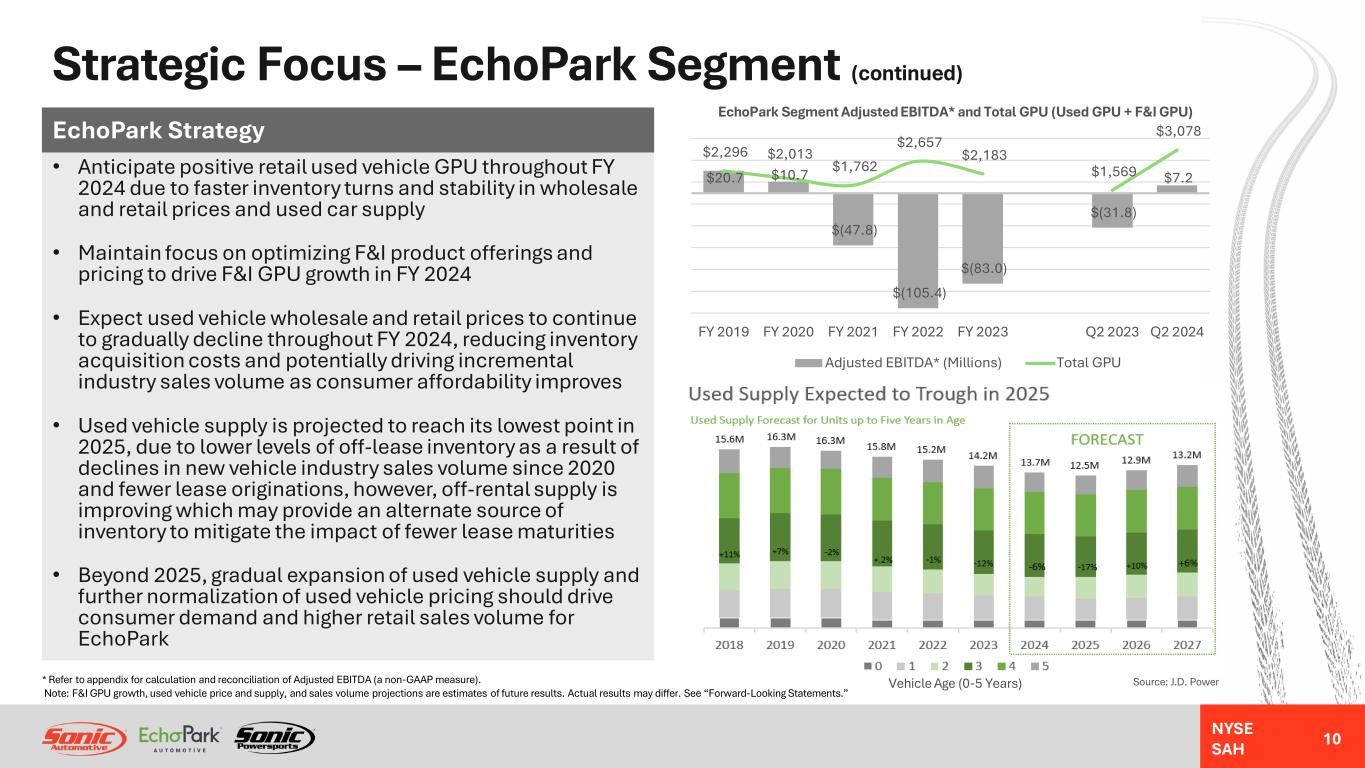 NYSE SAH Strategic Focus – EchoPark Segment • Returned to positive segment adjusted EBITDA* of $7.3 Million in Q1 2024 and $7.2 Million in Q2 2024 after 3 years of industry- driven headwinds • Focus on leveraging retail sales volume momentum and improving used market backdrop to generate positive adjusted EBITDA* and significant year-over-year adjusted EBITDA* growth in FY 2024 • Expect to resume disciplined expansion of EchoPark footprint once used vehicle market conditions are supportive • Long-term goal to reach 90% of the U.S. population • Below-market pricing and no-haggle, transparent guest experience expected to drive market share gains EchoPark Strategy * Refer to appendix for calculation and reconciliation of Adjusted EBITDA (a non-GAAP measure). Note: Adjusted EBITDA and footprint expansion projections are estimates of future results. Actual results may differ. See “Forward-Looking Statements.” Financial data may also include certain forward-looking information that is not presented in accordance with GAAP. We believe that a quantitative reconciliation of such forward-looking information to the most directly comparable GAAP financial measure cannot be made available without unreasonable efforts, because a reconciliation of these non-GAAP financial measures would require an estimate of future non-operating items such as impairment charges or gain/loss on property dispositions. Neither the timing nor likelihood of these events, nor their probable significance, can be quantified with a reasonable degree of accuracy. Accordingly, a reconciliation of such forward-looking information to the most directly comparable GAAP financial measure is not provided. Note: “EchoPark Operations” chart data includes currently operating stores and corporate/holding company results. “Closed Stores” chart data includes results from stores that are not currently in operation as of the date of this presentation. Average store count is the weighted average number of stores in the “EchoPark Operations” group for each period. $22.2 $16.7 $(27.0) $(70.1) $(49.5) $(18.4) $9.0 $(0.8) $(5.7) $(19.3) $(35.3) $(33.5) $(13.4) $(1.8) $(120) $(90) $(60) $(30) $- $30 FY 2019 FY 2020 FY 2021 FY 2022 FY 2023 Q2 2023 Q2 2024 EchoPark Segment Adjusted EBITDA* (Millions) EchoPark Operations (with Holding Company) Closed Stores 49,520 57,161 77,835 64,107 73,676 17,084 16,641 - 200 400 600 800 1,000 FY 2019 FY 2020 FY 2021 FY 2022 FY 2023 Q2 2023 Q2 2024M on th ly V ol um e Pe r S to re EchoPark Segment Retail Unit Sales Volume Average Monthly Volume Per Store Used Retail Unit Sales Volume Average Store Count 50 18 9