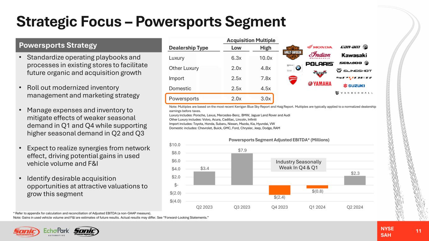 NYSE SAH Strategic Focus – EchoPark Segment (continued) 10 • Anticipate positive retail used vehicle GPU throughout FY 2024 due to faster inventory turns and stability in wholesale and retail prices and used car supply • Maintain focus on optimizing F&I product offerings and pricing to drive F&I GPU growth in FY 2024 • Expect used vehicle wholesale and retail prices to continue to gradually decline throughout FY 2024, reducing inventory acquisition costs and potentially driving incremental industry sales volume as consumer affordability improves • Used vehicle supply is projected to reach its lowest point in 2025, due to lower levels of off-lease inventory as a result of declines in new vehicle industry sales volume since 2020 and fewer lease originations, however, off-rental supply is improving which may provide an alternate source of inventory to mitigate the impact of fewer lease maturities • Beyond 2025, gradual expansion of used vehicle supply and further normalization of used vehicle pricing should drive consumer demand and higher retail sales volume for EchoPark EchoPark Strategy $20.7 $10.7 $(47.8) $(105.4) $(83.0) $(31.8) $7.2 $2,296 $2,013 $1,762 $2,657 $2,183 $1,569 $3,078 FY 2019 FY 2020 FY 2021 FY 2022 FY 2023 Q2 2023 Q2 2024 EchoPark Segment Adjusted EBITDA* and Total GPU (Used GPU + F&I GPU) Adjusted EBITDA* (Millions) Total GPU Source: J.D. PowerVehicle Age (0-5 Years)* Refer to appendix for calculation and reconciliation of Adjusted EBITDA (a non-GAAP measure). Note: F&I GPU growth, used vehicle price and supply, and sales volume projections are estimates of future results. Actual results may differ. See “Forward-Looking Statements.”
