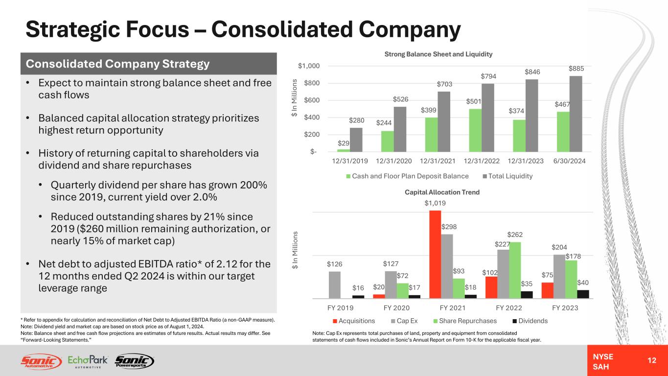 NYSE SAH 11 • Standardize operating playbooks and processes in existing stores to facilitate future organic and acquisition growth • Roll out modernized inventory management and marketing strategy • Manage expenses and inventory to mitigate effects of weaker seasonal demand in Q1 and Q4 while supporting higher seasonal demand in Q2 and Q3 • Expect to realize synergies from network effect, driving potential gains in used vehicle volume and F&I • Identify desirable acquisition opportunities at attractive valuations to grow this segment Powersports Strategy Note: Multiples are based on the most recent Kerrigan Blue Sky Report and Haig Report. Multiples are typically applied to a normalized dealership earnings before taxes. Luxury includes: Porsche, Lexus, Mercedes-Benz, BMW, Jaguar Land Rover and Audi Other Luxury includes: Volvo, Acura, Cadillac, Lincoln, Infiniti Import includes: Toyota, Honda, Subaru, Nissan, Mazda, Kia, Hyundai, VW Domestic includes: Chevrolet, Buick, GMC, Ford, Chrysler, Jeep, Dodge, RAM Acquisition Multiple Dealership Type Low High Luxury 6.3x 10.0x Other Luxury 2.0x 4.8x Import 2.5x 7.8x Domestic 2.5x 4.5x Powersports 2.0x 3.0x Strategic Focus – Powersports Segment * Refer to appendix for calculation and reconciliation of Adjusted EBITDA (a non-GAAP measure). Note: Gains in used vehicle volume and F&I are estimates of future results. Actual results may differ. See “Forward-Looking Statements.” $3.4 $7.9 $(2.4) $(0.8) $2.3 $(4.0) $(2.0) $- $2.0 $4.0 $6.0 $8.0 $10.0 Q2 2023 Q3 2023 Q4 2023 Q1 2024 Q2 2024 Powersports Segment Adjusted EBITDA* (Millions) Industry Seasonally Weak In Q4 & Q1