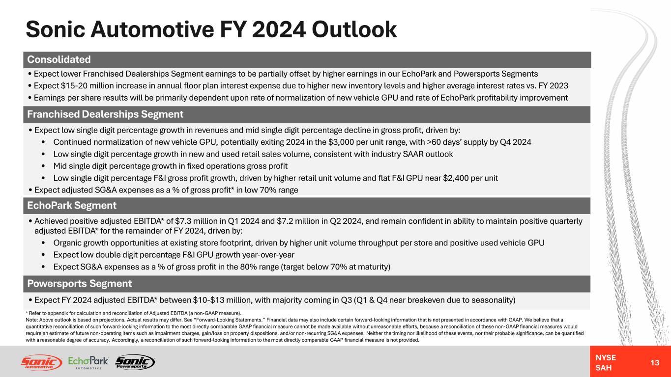 NYSE SAH Strategic Focus – Consolidated Company 12 • Expect to maintain strong balance sheet and free cash flows • Balanced capital allocation strategy prioritizes highest return opportunity • History of returning capital to shareholders via dividend and share repurchases • Quarterly dividend per share has grown 200% since 2019, current yield over 2.0% • Reduced outstanding shares by 21% since 2019 ($260 million remaining authorization, or nearly 15% of market cap) • Net debt to adjusted EBITDA ratio* of 2.12 for the 12 months ended Q2 2024 is within our target leverage range Consolidated Company Strategy $29 $244 $399 $501 $374 $467 $280 $526 $703 $794 $846 $885 $- $200 $400 $600 $800 $1,000 12/31/2019 12/31/2020 12/31/2021 12/31/2022 12/31/2023 6/30/2024 $ In M ill io ns Strong Balance Sheet and Liquidity Cash and Floor Plan Deposit Balance Total Liquidity * Refer to appendix for calculation and reconciliation of Net Debt to Adjusted EBITDA Ratio (a non-GAAP measure). Note: Dividend yield and market cap are based on stock price as of August 1, 2024. Note: Balance sheet and free cash flow projections are estimates of future results. Actual results may differ. See “Forward-Looking Statements.” $20 $1,019 $102 $75 $126 $127 $298 $227 $204 $72 $93 $262 $178 $16 $17 $18 $35 $40 FY 2019 FY 2020 FY 2021 FY 2022 FY 2023 $ In M ill io ns Capital Allocation Trend Acquisitions Cap Ex Share Repurchases Dividends Note: Cap Ex represents total purchases of land, property and equipment from consolidated statements of cash flows included in Sonic’s Annual Report on Form 10-K for the applicable fiscal year.