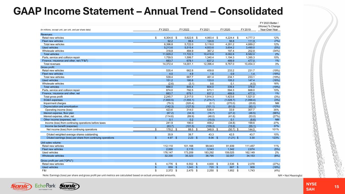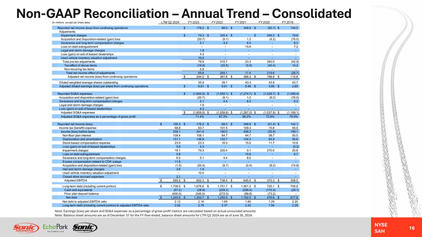 NYSE SAH GAAP Income Statement – Annual Trend – Consolidated 15 NM = Not MeaningfulNote: Earnings (loss) per share and gross profit per unit metrics are calculated based on actual unrounded amounts. FY 2023 Better / (Worse) % Change (In millions, except unit, per unit, and per share data) FY 2023 FY 2022 FY 2021 FY 2020 FY 2019 Year-Over-Year Revenues: Retail new vehicles 6,304.6$ 5,622.6$ 4,993.4$ 4,224.4$ 4,777.3$ 12% Fleet new vehicles 92.2 99.4 124.6 56.8 111.9 (7%) Total new vehicles 6,396.8 5,722.0 5,118.0 4,281.2 4,889.2 12% Used vehicles 5,213.6 5,515.4 4,933.6 3,604.2 3,490.0 (5%) Wholesale vehicles 318.8 484.9 367.2 197.4 202.8 (34%) Total vehicles 11,929.2 11,722.3 10,418.8 8,082.8 8,582.0 2% Parts, service and collision repair 1,759.5 1,599.7 1,340.4 1,194.3 1,395.3 10% Finance, insurance and other, net ("F&I") 683.7 679.1 637.2 489.9 477.0 1% Total revenues 14,372.4 14,001.1 12,396.4 9,767.0 10,454.3 3% Gross profit: Retail new vehicles 535.4 662.8 459.8 233.2 231.7 (19%) Fleet new vehicles 4.0 4.9 1.6 0.9 1.4 (18%) Total new vehicles 539.4 667.7 461.4 234.1 233.1 (19%) Used vehicles 151.2 180.8 133.0 105.2 147.4 (16%) Wholesale vehicles (2.6) (3.1) 9.6 0.1 (4.5) 16% Total vehicles 688.0 845.4 604.0 339.4 376.0 (19%) Parts, service and collision repair 874.0 792.5 673.1 594.3 668.0 10% Finance, insurance and other, net 683.7 679.1 637.2 489.9 477.0 1% Total gross profit 2,245.7 2,317.0 1,914.3 1,423.6 1,521.0 (3%) SG&A expenses (1,600.5) (1,555.1) (1,274.7) (1,028.7) (1,099.4) (3%) Impairment charges (79.3) (320.4) (0.1) (270.0) (20.8) NM Depreciation and amortization (142.3) (127.5) (101.1) (91.0) (93.1) (12%) Operating income (loss) 423.6 314.0 538.4 33.9 307.7 35% Interest expense, floor plan (67.2) (34.3) (16.7) (27.2) (48.5) (96%) Interest expense, other, net (114.6) (89.9) (48.0) (41.6) (53.0) (27%) Other income (expense), net 0.1 0.2 (15.5) 0.1 (6.6) NM Income (loss) from continuing operations before taxes 241.9 190.0 458.2 (34.8) 199.6 27% Income tax benefit (expense) (63.7) (101.5) (109.3) (15.9) (55.1) 37% Net income (loss) from continuing operations 178.2$ 88.5$ 348.9$ (50.7)$ 144.5$ 101% Diluted weighted-average shares outstanding 35.9 39.7 43.3 42.5 43.7 10% Diluted earnings (loss) per share from continuing operations 4.97$ 2.23$ 8.06$ (1.21)$ 3.30$ 123% Unit sales volume: Retail new vehicles 112,110 101,168 99,943 91,939 111,457 11% Fleet new vehicles 2,000 2,115 3,543 1,342 2,674 (5%) Used vehicles 176,147 173,209 183,292 159,025 162,149 2% Wholesale vehicles 32,330 35,323 36,795 32,057 34,153 (8%) Gross profit per unit ("GPU"): Retail new vehicles 4,776$ 6,552$ 4,600$ 2,536$ 2,078$ (27%) Used vehicles 859$ 1,043$ 720$ 667$ 909$ (18%) F&I 2,372$ 2,475$ 2,250$ 1,952$ 1,743$ (4%)