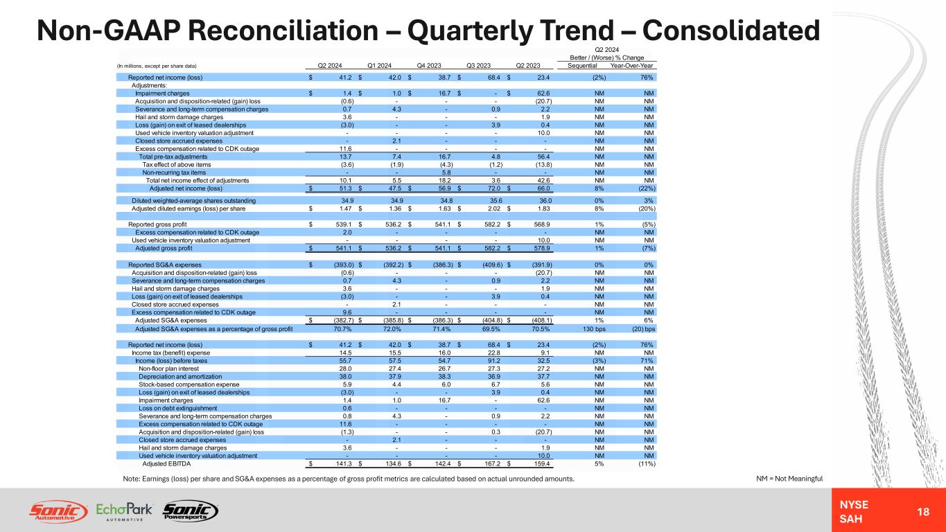 NYSE SAH GAAP Income Statement – Quarterly Trend – Consolidated 17 NM = Not MeaningfulNote: Earnings (loss) per share and gross profit per unit metrics are calculated based on actual unrounded amounts. Q2 2024 Better / (Worse) % Change (In millions, except unit, per unit, and per share data) Q2 2024 Q1 2024 Q4 2023 Q3 2023 Q2 2023 Sequential Year-Over-Year Revenues: Retail new vehicles 1,552.6$ 1,455.8$ 1,680.2$ 1,573.5$ 1,608.2$ 7% (3%) Fleet new vehicles 26.2 19.6 21.8 23.2 28.3 34% (7%) Total new vehicles 1,578.8 1,475.4 1,702.0 1,596.7 1,636.5 7% (4%) Used vehicles 1,186.2 1,215.6 1,222.4 1,340.4 1,305.9 (2%) (9%) Wholesale vehicles 71.3 77.3 62.6 79.3 91.5 (8%) (22%) Total vehicles 2,836.3 2,768.3 2,987.0 3,016.4 3,033.9 2% (7%) Parts, service and collision repair 444.1 446.7 431.9 453.4 443.7 (1%) 0% Finance, insurance and other, net ("F&I") 172.6 169.0 166.0 173.7 175.3 2% (2%) Total revenues 3,453.0 3,384.0 3,584.9 3,643.5 3,652.9 2% (5%) Gross profit: Retail new vehicles 97.8 96.4 124.5 131.4 141.4 1% (31%) Fleet new vehicles 1.0 0.7 0.9 0.9 1.3 55% (23%) Total new vehicles 98.8 97.1 125.4 132.3 142.7 2% (31%) Used vehicles 44.7 47.0 37.5 52.3 31.5 (5%) 42% Wholesale vehicles (0.6) (0.8) (3.2) (1.4) (1.0) 17% 40% Total vehicles 142.9 143.3 159.7 183.2 173.2 0% (17%) Parts, service and collision repair 223.6 223.9 215.4 225.3 220.4 0% 1% Finance, insurance and other, net 172.6 169.0 166.0 173.7 175.3 2% (2%) Total gross profit 539.1 536.2 541.1 582.2 568.9 1% (5%) SG&A expenses (393.0) (392.2) (386.3) (409.6) (391.9) 0% 0% Impairment charges (1.4) (1.0) (16.7) - (62.6) NM NM Depreciation and amortization (37.0) (36.3) (36.6) (35.2) (36.1) (2%) (2%) Operating income (loss) 107.7 106.7 101.5 137.4 78.3 1% 38% Interest expense, floor plan (22.2) (20.3) (18.4) (17.4) (17.0) (10%) (31%) Interest expense, other, net (29.3) (29.0) (28.3) (29.0) (28.9) (1%) (1%) Other income (expense), net (0.5) 0.1 (0.1) 0.2 0.1 NM NM Income (loss) before taxes 55.7 57.5 54.7 91.2 32.5 (3%) 71% Income tax benefit (expense) (14.5) (15.5) (16.0) (22.8) (9.1) 7% (59%) Net income (loss) 41.2$ 42.0$ 38.7$ 68.4$ 23.4$ (2%) 76% Diluted weighted-average shares outstanding 34.9 34.9 34.8 35.6 36.0 0% 3% Diluted earnings (loss) per share 1.18$ 1.20$ 1.11$ 1.92$ 0.65$ (2%) 82% Unit sales volume: Retail new vehicles 27,705 26,142 29,439 28,260 28,754 6% (4%) Fleet new vehicles 514 379 500 469 590 36% (13%) Used vehicles 42,831 44,056 42,216 45,428 42,972 (3%) 0% Wholesale vehicles 7,859 8,112 7,127 7,996 8,801 (3%) (11%) Gross profit per unit ("GPU"): Retail new vehicles 3,531$ 3,688$ 4,230$ 4,649$ 4,918$ (4%) (28%) Used vehicles 1,044$ 1,068$ 888$ 1,150$ 732$ (2%) 43% F&I 2,447$ 2,407$ 2,317$ 2,357$ 2,445$ 2% 0%