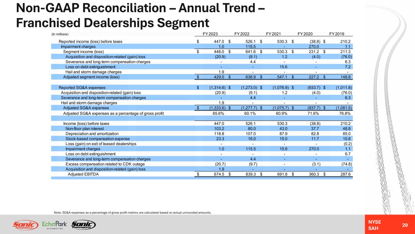 NYSE SAH GAAP Income Statement – Annual Trend – Franchised Dealerships Segment 19 NM = Not MeaningfulNote: Gross profit per unit metrics are calculated based on actual unrounded amounts. FY 2023 Better / (Worse) % Change (In millions, except unit and per unit data) FY 2023 FY 2022 FY 2021 FY 2020 FY 2019 Year-Over-Year Revenues: Retail new vehicles 6,215.0$ 5,581.6$ 4,984.4$ 4,224.4$ 4,777.3$ 11% Fleet new vehicles 92.2 99.4 124.6 56.8 111.9 (7%) Total new vehicles 6,307.2 5,681.0 5,109.0 4,281.2 4,889.2 11% Used vehicles 3,050.3 3,391.5 2,901.0 2,345.9 2,493.5 (10%) Wholesale vehicles 204.5 314.0 257.2 168.7 180.0 (35%) Total vehicles 9,562.0 9,386.5 8,267.2 6,795.8 7,562.7 2% Parts, service and collision repair 1,714.2 1,588.0 1,340.4 1,194.4 1,366.5 8% Finance, insurance and other, net ("F&I") 498.6 510.1 443.5 357.8 363.1 (2%) Total revenues 11,774.8 11,484.6 10,051.1 8,348.0 9,292.3 3% Gross profit: Retail new vehicles 518.7 655.3 458.8 233.2 231.7 (21%) Fleet new vehicles 4.0 4.9 1.5 0.9 1.4 (18%) Total new vehicles 522.7 660.2 460.3 234.1 233.1 (21%) Used vehicles 162.9 174.5 188.1 122.9 147.5 (7%) Wholesale vehicles (3.2) (6.4) 0.6 (0.8) (4.1) 49% Total vehicles 682.4 828.3 649.0 356.2 376.5 (18%) Parts, service and collision repair 852.7 786.7 673.1 595.4 669.0 8% Finance, insurance and other, net 498.5 510.1 443.5 357.8 363.1 (2%) Total gross profit 2,033.6 2,125.1 1,765.6 1,309.4 1,408.6 (4%) SG&A expenses (1,314.6) (1,273.0) (1,076.9) (933.7) (1,011.8) (3%) Impairment charges (1.0) (115.5) - (270.0) (1.1) NM Depreciation and amortization (112.3) (101.8) (84.8) (79.9) (82.6) (10%) Operating income (loss) 605.7 634.8 603.9 25.8 313.1 (5%) Interest expense, floor plan (49.1) (23.6) (11.8) (24.0) (45.1) (108%) Interest expense, other, net (109.7) (85.1) (46.3) (40.7) (51.2) (29%) Other income (expense), net 0.1 - (15.5) 0.1 (6.6) NM Income (loss) from continuing operations before taxes 447.0$ 526.1$ 530.3$ (38.8)$ 210.2$ (15%) Unit sales volume: Retail new vehicles 107,257 99,424 99,815 91,939 111,457 8% Fleet new vehicles 2,000 2,115 3,543 1,342 2,674 (5%) Used vehicles 100,210 108,512 105,457 101,864 112,629 (8%) Wholesale vehicles 20,602 24,052 25,128 24,879 28,379 (14%) Gross profit per unit ("GPU"): Retail new vehicles 4,836$ 6,591$ 4,595$ 2,536$ 2,078$ (27%) Used vehicles 1,626$ 1,607$ 1,784$ 1,207$ 1,310$ 1% F&I 2,403$ 2,453$ 2,160$ 1,846$ 1,620$ (2%)