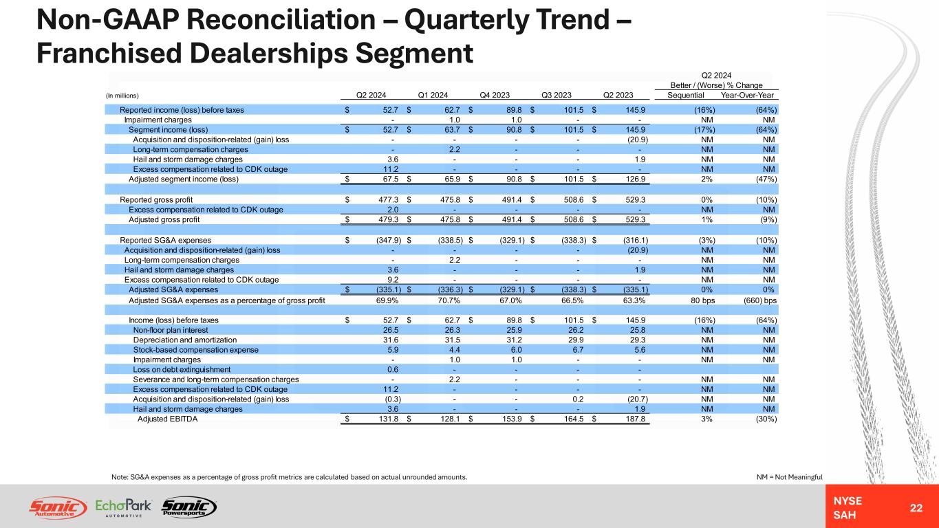 NYSE SAH GAAP Income Statement – Quarterly Trend – Franchised Dealerships Segment 21 NM = Not MeaningfulNote: Gross profit per unit metrics are calculated based on actual unrounded amounts. Q2 2024 Better / (Worse) % Change (In millions, except unit and per unit data) Q2 2024 Q1 2024 Q4 2023 Q3 2023 Q2 2023 Sequential Year-Over-Year Revenues: Retail new vehicles 1,530.9$ 1,439.9$ 1,664.1$ 1,546.7$ 1,583.3$ 6% (3%) Fleet new vehicles 26.2 19.6 21.8 23.2 28.3 34% (7%) Total new vehicles 1,557.1 1,459.5 1,685.9 1,569.9 1,611.6 7% (3%) Used vehicles 732.1 729.3 727.5 780.7 774.5 0% (5%) Wholesale vehicles 48.4 48.6 39.3 51.4 55.6 0% (13%) Total vehicles 2,337.6 2,237.4 2,452.7 2,402.0 2,441.7 4% (4%) Parts, service and collision repair 434.4 439.9 425.2 431.8 433.4 (1%) 0% Finance, insurance and other, net ("F&I") 124.2 119.6 123.2 126.0 132.2 4% (6%) Total revenues 2,896.2 2,796.9 3,001.1 2,959.8 3,007.3 4% (4%) Gross profit: Retail new vehicles 94.9 94.1 122.2 125.5 136.9 1% (31%) Fleet new vehicles 1.0 0.7 0.9 0.9 1.3 55% (23%) Total new vehicles 95.9 94.8 123.1 126.4 138.2 1% (31%) Used vehicles 38.7 40.8 35.1 42.6 44.5 (5%) (13%) Wholesale vehicles (0.5) (0.2) (2.7) (1.5) (1.0) (169%) 50% Total vehicles 134.1 135.4 155.5 167.5 181.7 (1%) (26%) Parts, service and collision repair 219.0 220.8 212.6 215.1 215.4 (1%) 2% Finance, insurance and other, net 124.2 119.6 123.2 126.0 132.2 4% (6%) Total gross profit 477.3 475.8 491.3 508.6 529.3 0% (10%) SG&A expenses (347.9) (338.5) (329.1) (338.3) (316.1) (3%) (10%) Impairment charges - (1.0) (1.0) - - NM NM Depreciation and amortization (30.4) (29.8) (29.4) (28.2) (27.9) (2%) (9%) Operating income (loss) 99.0 106.5 131.8 142.1 185.3 (7%) (47%) Interest expense, floor plan (18.0) (16.0) (14.6) (12.9) (11.9) (13%) (53%) Interest expense, other, net (27.8) (27.8) (27.5) (27.9) (27.5) 0% (1%) Other income (expense), net (0.5) - 0.1 0.2 - NM NM Income (loss) before taxes 52.7$ 62.7$ 89.8$ 101.5$ 145.9$ (16%) (64%) Unit sales volume: Retail new vehicles 26,512 25,297 28,491 26,869 27,358 5% (3%) Fleet new vehicles 514 379 500 469 590 36% (13%) Used vehicles 25,668 25,666 24,365 25,541 25,197 0% 2% Wholesale vehicles 5,248 5,105 4,440 5,163 5,516 3% (5%) Gross profit per unit ("GPU"): Retail new vehicles 3,579$ 3,722$ 4,289$ 4,672$ 5,003$ (4%) (28%) Used vehicles 1,508$ 1,592$ 1,440$ 1,666$ 1,765$ (5%) (15%) F&I 2,380$ 2,348$ 2,330$ 2,403$ 2,516$ 1% (5%)