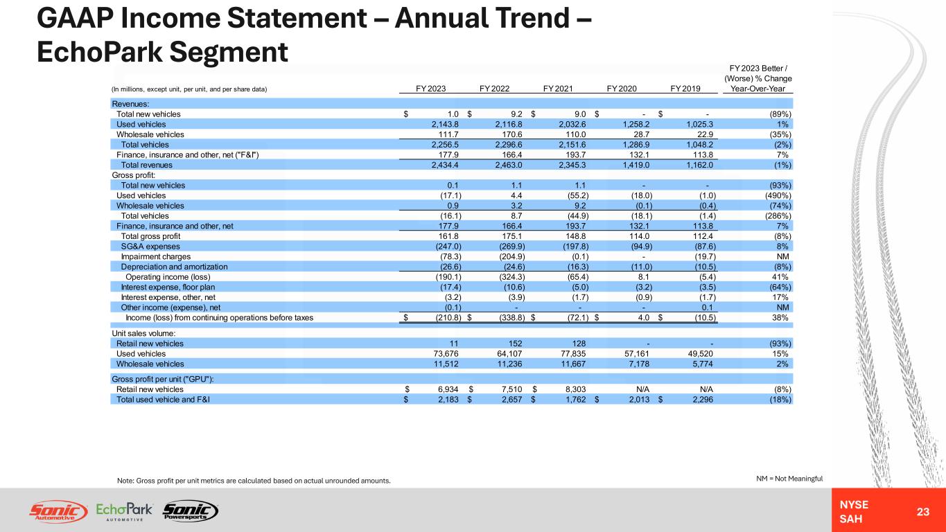 NYSE SAH GAAP Income Statement – Annual Trend – EchoPark Segment 23 NM = Not MeaningfulNote: Gross profit per unit metrics are calculated based on actual unrounded amounts. FY 2023 Better / (Worse) % Change (In millions, except unit, per unit, and per share data) FY 2023 FY 2022 FY 2021 FY 2020 FY 2019 Year-Over-Year Revenues: Total new vehicles 1.0$ 9.2$ 9.0$ -$ -$ (89%) Used vehicles 2,143.8 2,116.8 2,032.6 1,258.2 1,025.3 1% Wholesale vehicles 111.7 170.6 110.0 28.7 22.9 (35%) Total vehicles 2,256.5 2,296.6 2,151.6 1,286.9 1,048.2 (2%) Finance, insurance and other, net ("F&I") 177.9 166.4 193.7 132.1 113.8 7% Total revenues 2,434.4 2,463.0 2,345.3 1,419.0 1,162.0 (1%) Gross profit: Total new vehicles 0.1 1.1 1.1 - - (93%) Used vehicles (17.1) 4.4 (55.2) (18.0) (1.0) (490%) Wholesale vehicles 0.9 3.2 9.2 (0.1) (0.4) (74%) Total vehicles (16.1) 8.7 (44.9) (18.1) (1.4) (286%) Finance, insurance and other, net 177.9 166.4 193.7 132.1 113.8 7% Total gross profit 161.8 175.1 148.8 114.0 112.4 (8%) SG&A expenses (247.0) (269.9) (197.8) (94.9) (87.6) 8% Impairment charges (78.3) (204.9) (0.1) - (19.7) NM Depreciation and amortization (26.6) (24.6) (16.3) (11.0) (10.5) (8%) Operating income (loss) (190.1) (324.3) (65.4) 8.1 (5.4) 41% Interest expense, floor plan (17.4) (10.6) (5.0) (3.2) (3.5) (64%) Interest expense, other, net (3.2) (3.9) (1.7) (0.9) (1.7) 17% Other income (expense), net (0.1) - - - 0.1 NM Income (loss) from continuing operations before taxes (210.8)$ (338.8)$ (72.1)$ 4.0$ (10.5)$ 38% Unit sales volume: Retail new vehicles 11 152 128 - - (93%) Used vehicles 73,676 64,107 77,835 57,161 49,520 15% Wholesale vehicles 11,512 11,236 11,667 7,178 5,774 2% Gross profit per unit ("GPU"): Retail new vehicles 6,934$ 7,510$ 8,303$ N/A N/A (8%) Total used vehicle and F&I 2,183$ 2,657$ 1,762$ 2,013$ 2,296$ (18%)