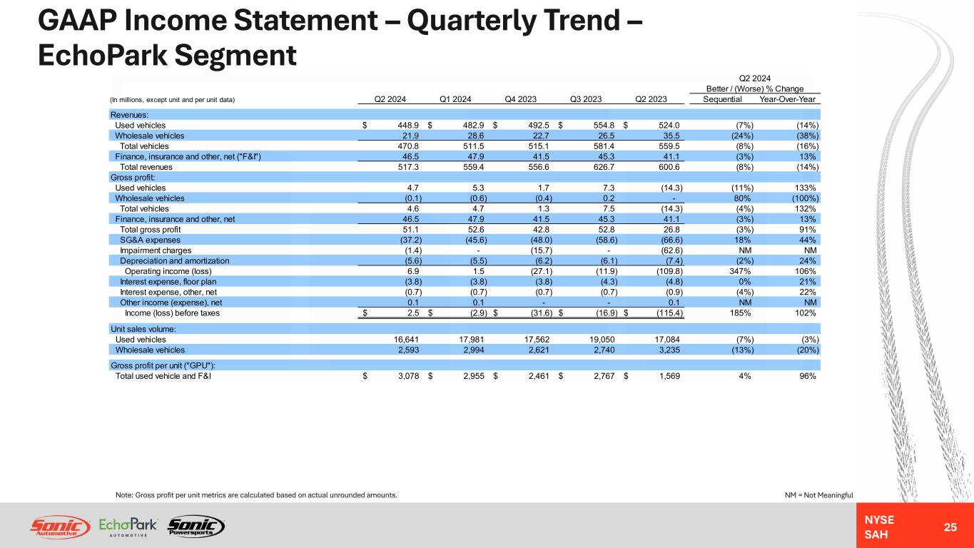 NYSE SAH Non-GAAP Reconciliation – Annual Trend – EchoPark Segment 24 Note: SG&A expenses as a percentage of gross profit metrics are calculated based on actual unrounded amounts. (In millions) FY 2023 FY 2022 FY 2021 FY 2020 FY 2019 Reported income (loss) before taxes (210.8)$ (338.8)$ (72.1)$ 4.0$ (10.5)$ Impairment charges 78.3 204.9 0.1 - 19.7 Segment income (loss) (132.5)$ (133.9)$ (72.0)$ 4.0$ 9.2$ Acquisition and disposition-related (gain) loss 0.2 - - (5.2) - Severance and long-term compensation charges 5.1 - 6.5 - - Loss (gain) on exit of leased dealerships 4.3 - - - - Used vehicle inventory valuation adjustment 10.0 - - - - Adjusted segment income (loss) (112.9)$ (133.9)$ (65.5)$ (1.2)$ 9.2$ Reported SG&A expenses (247.0)$ (269.9)$ (197.8)$ (94.9)$ (87.6)$ Acquisition and disposition-related (gain) loss 0.2 - - (5.2) - Severance and long-term compensation charges 5.1 - 6.5 - - Loss (gain) on exit of leased dealerships 4.3 - - - - Adjusted SG&A expenses (237.4)$ (269.9)$ (191.3)$ (100.1)$ (87.6)$ Adjusted SG&A expenses as a percentage of gross profit 138.2% 154.1% 128.6% 87.6% 77.9% Income (loss) before taxes (210.8) (338.8) (72.1) 4.1 (10.5) Non-floor plan interest 3.2 3.7 1.7 0.9 1.8 Depreciation and amortization 26.6 24.8 16.4 11.2 10.4 Loss (gain) on exit of leased dealerships 4.3 - - - - Impairment charges 78.3 204.9 0.1 - 19.7 Severance and long-term compensation charges 5.1 - 8.0 - - Acquisition and disposition-related (gain) loss 0.3 - (0.4) (5.2) - Used vehicle inventory valuation adjustment 10.0 - - - - Adjusted EBITDA (83.0)$ (105.4)$ (46.3)$ 11.0$ 21.4$ Adjusted EBITDA - Closed Stores (33.5)$ (35.3)$ (19.3)$ (5.7)$ (0.8)$ Adjusted EBITDA - EchoPark Operations (with Holding Company) (49.5) (70.1) (27.0) 16.7 22.2 Adjusted EBITDA - Total EchoPark Segment (83.0)$ (105.4)$ (46.3)$ 11.0$ 21.4$