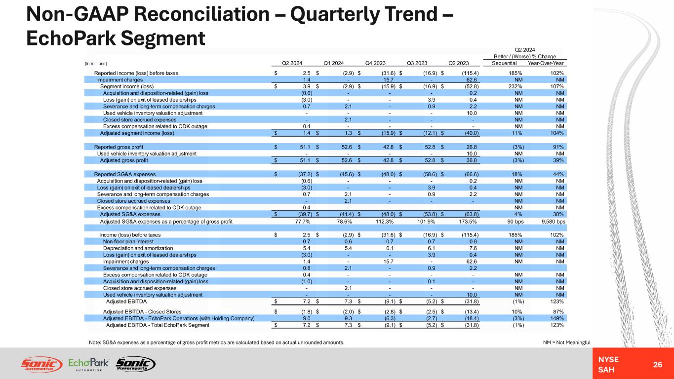 NYSE SAH GAAP Income Statement – Quarterly Trend – EchoPark Segment 25 NM = Not MeaningfulNote: Gross profit per unit metrics are calculated based on actual unrounded amounts. Q2 2024 Better / (Worse) % Change (In millions, except unit and per unit data) Q2 2024 Q1 2024 Q4 2023 Q3 2023 Q2 2023 Sequential Year-Over-Year Revenues: Used vehicles 448.9$ 482.9$ 492.5$ 554.8$ 524.0$ (7%) (14%) Wholesale vehicles 21.9 28.6 22.7 26.5 35.5 (24%) (38%) Total vehicles 470.8 511.5 515.1 581.4 559.5 (8%) (16%) Finance, insurance and other, net ("F&I") 46.5 47.9 41.5 45.3 41.1 (3%) 13% Total revenues 517.3 559.4 556.6 626.7 600.6 (8%) (14%) Gross profit: Used vehicles 4.7 5.3 1.7 7.3 (14.3) (11%) 133% Wholesale vehicles (0.1) (0.6) (0.4) 0.2 - 80% (100%) Total vehicles 4.6 4.7 1.3 7.5 (14.3) (4%) 132% Finance, insurance and other, net 46.5 47.9 41.5 45.3 41.1 (3%) 13% Total gross profit 51.1 52.6 42.8 52.8 26.8 (3%) 91% SG&A expenses (37.2) (45.6) (48.0) (58.6) (66.6) 18% 44% Impairment charges (1.4) - (15.7) - (62.6) NM NM Depreciation and amortization (5.6) (5.5) (6.2) (6.1) (7.4) (2%) 24% Operating income (loss) 6.9 1.5 (27.1) (11.9) (109.8) 347% 106% Interest expense, floor plan (3.8) (3.8) (3.8) (4.3) (4.8) 0% 21% Interest expense, other, net (0.7) (0.7) (0.7) (0.7) (0.9) (4%) 22% Other income (expense), net 0.1 0.1 - - 0.1 NM NM Income (loss) before taxes 2.5$ (2.9)$ (31.6)$ (16.9)$ (115.4)$ 185% 102% Unit sales volume: Used vehicles 16,641 17,981 17,562 19,050 17,084 (7%) (3%) Wholesale vehicles 2,593 2,994 2,621 2,740 3,235 (13%) (20%) Gross profit per unit ("GPU"): Total used vehicle and F&I 3,078$ 2,955$ 2,461$ 2,767$ 1,569$ 4% 96%
