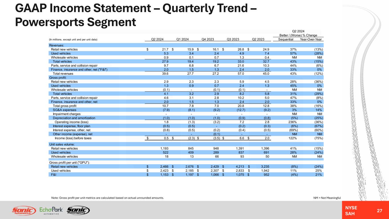 NYSE SAH Non-GAAP Reconciliation – Quarterly Trend – EchoPark Segment 26 NM = Not MeaningfulNote: SG&A expenses as a percentage of gross profit metrics are calculated based on actual unrounded amounts. Q2 2024 Better / (Worse) % Change (In millions) Q2 2024 Q1 2024 Q4 2023 Q3 2023 Q2 2023 Sequential Year-Over-Year Reported income (loss) before taxes 2.5$ (2.9)$ (31.6)$ (16.9)$ (115.4)$ 185% 102% Impairment charges 1.4 - 15.7 - 62.6 NM NM Segment income (loss) 3.9$ (2.9)$ (15.9)$ (16.9)$ (52.8)$ 232% 107% Acquisition and disposition-related (gain) loss (0.6) - - - 0.2 NM NM Loss (gain) on exit of leased dealerships (3.0) - - 3.9 0.4 NM NM Severance and long-term compensation charges 0.7 2.1 - 0.9 2.2 NM NM Used vehicle inventory valuation adjustment - - - - 10.0 NM NM Closed store accrued expenses - 2.1 - - - NM NM Excess compensation related to CDK outage 0.4 - - - - NM NM Adjusted segment income (loss) 1.4$ 1.3$ (15.9)$ (12.1)$ (40.0)$ 11% 104% Reported gross profit 51.1$ 52.6$ 42.8$ 52.8$ 26.8$ (3%) 91% Used vehicle inventory valuation adjustment - - - - 10.0 NM NM Adjusted gross profit 51.1$ 52.6$ 42.8$ 52.8$ 36.8$ (3%) 39% Reported SG&A expenses (37.2)$ (45.6)$ (48.0)$ (58.6)$ (66.6)$ 18% 44% Acquisition and disposition-related (gain) loss (0.6) - - - 0.2 NM NM Loss (gain) on exit of leased dealerships (3.0) - - 3.9 0.4 NM NM Severance and long-term compensation charges 0.7 2.1 - 0.9 2.2 NM NM Closed store accrued expenses - 2.1 - - - NM NM Excess compensation related to CDK outage 0.4 - - - - NM NM Adjusted SG&A expenses (39.7)$ (41.4)$ (48.0)$ (53.8)$ (63.8)$ 4% 38% Adjusted SG&A expenses as a percentage of gross profit 77.7% 78.6% 112.3% 101.9% 173.5% 90 bps 9,580 bps Income (loss) before taxes 2.5$ (2.9)$ (31.6)$ (16.9)$ (115.4)$ 185% 102% Non-floor plan interest 0.7 0.6 0.7 0.7 0.8 NM NM Depreciation and amortization 5.4 5.4 6.1 6.1 7.6 NM NM Loss (gain) on exit of leased dealerships (3.0) - - 3.9 0.4 NM NM Impairment charges 1.4 - 15.7 - 62.6 NM NM Severance and long-term compensation charges 0.8 2.1 - 0.9 2.2 Excess compensation related to CDK outage 0.4 - - - - NM NM Acquisition and disposition-related (gain) loss (1.0) - - 0.1 - NM NM Closed store accrued expenses - 2.1 - - - NM NM Used vehicle inventory valuation adjustment - - - - 10.0 NM NM Adjusted EBITDA 7.2$ 7.3$ (9.1)$ (5.2)$ (31.8)$ (1%) 123% Adjusted EBITDA - Closed Stores (1.8)$ (2.0)$ (2.8)$ (2.5)$ (13.4)$ 10% 87% Adjusted EBITDA - EchoPark Operations (with Holding Company) 9.0 9.3 (6.3) (2.7) (18.4) (3%) 149% Adjusted EBITDA - Total EchoPark Segment 7.2$ 7.3$ (9.1)$ (5.2)$ (31.8)$ (1%) 123%