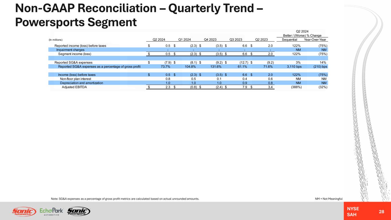 NYSE SAH GAAP Income Statement – Quarterly Trend – Powersports Segment 27 NM = Not MeaningfulNote: Gross profit per unit metrics are calculated based on actual unrounded amounts. Q2 2024 Better / (Worse) % Change (In millions, except unit and per unit data) Q2 2024 Q1 2024 Q4 2023 Q3 2023 Q2 2023 Sequential Year-Over-Year Revenues: Retail new vehicles 21.7$ 15.9$ 16.1$ 26.8$ 24.9$ 37% (13%) Used vehicles 5.3 3.4 2.4 4.9 7.4 57% (28%) Wholesale vehicles 0.9 0.1 0.7 1.3 0.4 NM NM Total vehicles 27.9 19.4 19.2 33.0 32.7 43% (15%) Parts, service and collision repair 9.7 6.8 6.7 21.6 10.3 44% (6%) Finance, insurance and other, net ("F&I") 2.0 1.5 1.3 2.4 2.0 33% 0% Total revenues 39.6 27.7 27.2 57.0 45.0 43% (12%) Gross profit: Retail new vehicles 2.9 2.3 2.3 5.9 4.5 28% (36%) Used vehicles 1.3 0.9 0.7 2.4 1.3 45% 0% Wholesale vehicles (0.1) - (0.1) (0.1) - NM NM Total vehicles 4.1 3.2 2.9 8.2 5.8 31% (29%) Parts, service and collision repair 4.6 3.1 2.8 10.2 5.0 47% (8%) Finance, insurance and other, net 2.0 1.5 1.3 2.4 2.0 33% 0% Total gross profit 10.7 7.8 7.0 20.8 12.8 38% (16%) SG&A expenses (7.9) (8.1) (9.2) (12.7) (9.2) 3% 14% Impairment charges - - - - - NM NM Depreciation and amortization (1.0) (1.0) (1.0) (0.9) (0.8) (5%) (25%) Operating income (loss) 1.8 (1.3) (3.2) 7.2 2.8 236% (36%) Interest expense, floor plan (0.5) (0.5) - (0.2) (0.3) (6%) (67%) Interest expense, other, net (0.8) (0.5) (0.2) (0.4) (0.5) (69%) (60%) Other income (expense), net - - (0.1) - - NM NM Income (loss) before taxes 0.5$ (2.3)$ (3.5)$ 6.6$ 2.0$ 122% (75%) Unit sales volume: Retail new vehicles 1,193 845 948 1,391 1,396 41% (15%) Used vehicles 522 409 289 837 691 28% (24%) Wholesale vehicles 18 13 66 93 50 NM NM Gross profit per unit ("GPU"): Retail new vehicles 2,466$ 2,676$ 2,429$ 4,213$ 3,235$ (8%) (24%) Used vehicles 2,423$ 2,185$ 2,307$ 2,833$ 1,942$ 11% 25% F&I 1,153$ 1,197$ 1,066$ 1,075$ 952$ (4%) 21%