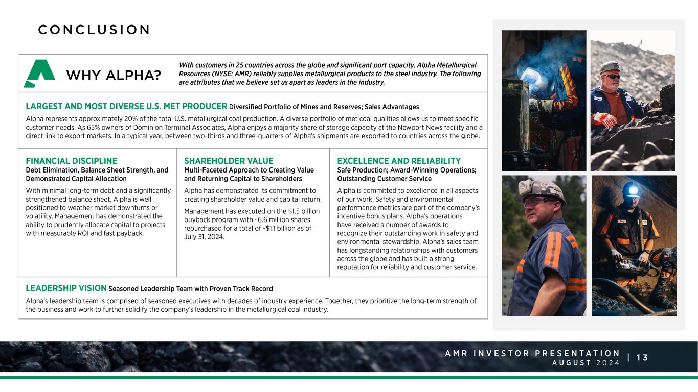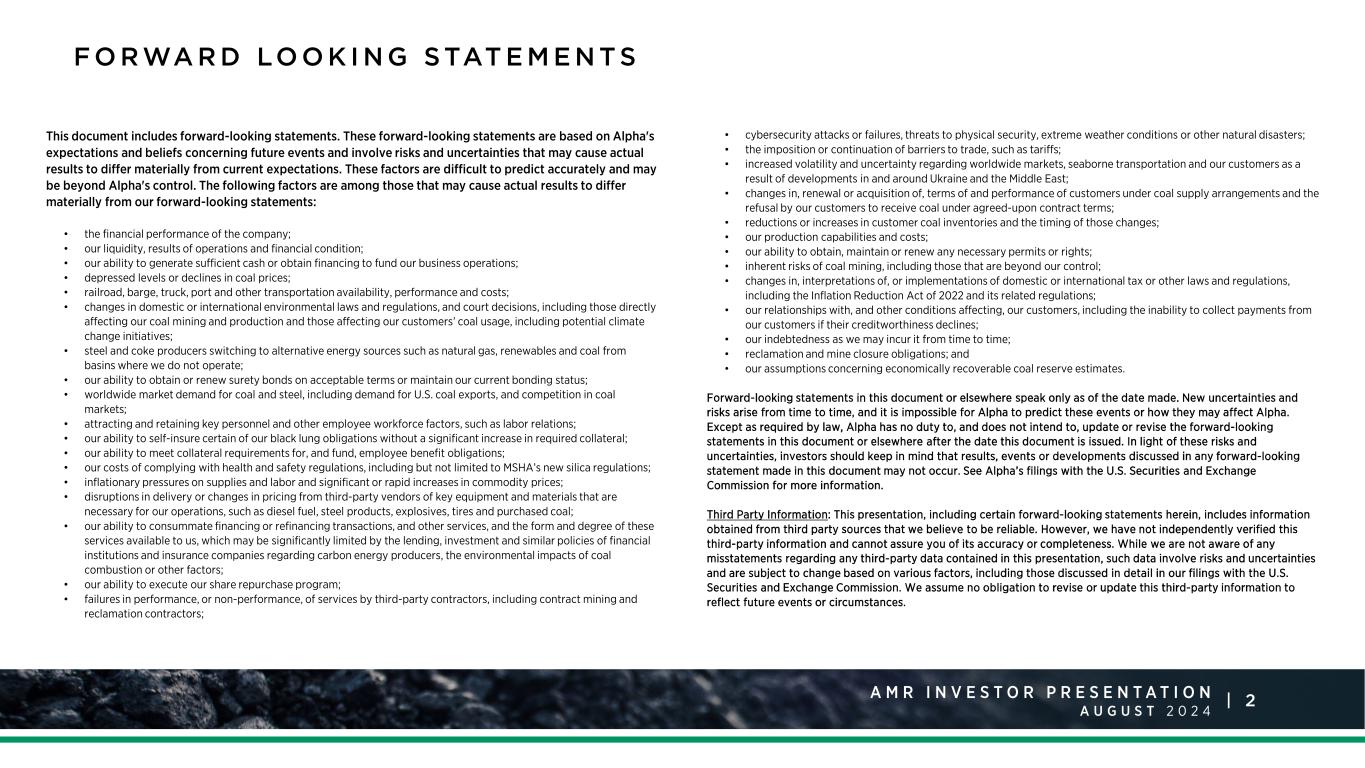 2A M R I N V E S T O R P R E S E N T A T I O N A U G U S T 2 0 2 4 | F O R WA R D LO O K I N G S TAT E M E N T S This document includes forward-looking statements. These forward-looking statements are based on Alpha's expectations and beliefs concerning future events and involve risks and uncertainties that may cause actual results to differ materially from current expectations. These factors are difficult to predict accurately and may be beyond Alpha's control. The following factors are among those that may cause actual results to differ materially from our forward-looking statements: • the financial performance of the company; • our liquidity, results of operations and financial condition; • our ability to generate sufficient cash or obtain financing to fund our business operations; • depressed levels or declines in coal prices; • railroad, barge, truck, port and other transportation availability, performance and costs; • changes in domestic or international environmental laws and regulations, and court decisions, including those directly affecting our coal mining and production and those affecting our customers’ coal usage, including potential climate change initiatives; • steel and coke producers switching to alternative energy sources such as natural gas, renewables and coal from basins where we do not operate; • our ability to obtain or renew surety bonds on acceptable terms or maintain our current bonding status; • worldwide market demand for coal and steel, including demand for U.S. coal exports, and competition in coal markets; • attracting and retaining key personnel and other employee workforce factors, such as labor relations; • our ability to self-insure certain of our black lung obligations without a significant increase in required collateral; • our ability to meet collateral requirements for, and fund, employee benefit obligations; • our costs of complying with health and safety regulations, including but not limited to MSHA’s new silica regulations; • inflationary pressures on supplies and labor and significant or rapid increases in commodity prices; • disruptions in delivery or changes in pricing from third-party vendors of key equipment and materials that are necessary for our operations, such as diesel fuel, steel products, explosives, tires and purchased coal; • our ability to consummate financing or refinancing transactions, and other services, and the form and degree of these services available to us, which may be significantly limited by the lending, investment and similar policies of financial institutions and insurance companies regarding carbon energy producers, the environmental impacts of coal combustion or other factors; • our ability to execute our share repurchase program; • failures in performance, or non-performance, of services by third-party contractors, including contract mining and reclamation contractors; • cybersecurity attacks or failures, threats to physical security, extreme weather conditions or other natural disasters; • the imposition or continuation of barriers to trade, such as tariffs; • increased volatility and uncertainty regarding worldwide markets, seaborne transportation and our customers as a result of developments in and around Ukraine and the Middle East; • changes in, renewal or acquisition of, terms of and performance of customers under coal supply arrangements and the refusal by our customers to receive coal under agreed-upon contract terms; • reductions or increases in customer coal inventories and the timing of those changes; • our production capabilities and costs; • our ability to obtain, maintain or renew any necessary permits or rights; • inherent risks of coal mining, including those that are beyond our control; • changes in, interpretations of, or implementations of domestic or international tax or other laws and regulations, including the Inflation Reduction Act of 2022 and its related regulations; • our relationships with, and other conditions affecting, our customers, including the inability to collect payments from our customers if their creditworthiness declines; • our indebtedness as we may incur it from time to time; • reclamation and mine closure obligations; and • our assumptions concerning economically recoverable coal reserve estimates. Forward-looking statements in this document or elsewhere speak only as of the date made. New uncertainties and risks arise from time to time, and it is impossible for Alpha to predict these events or how they may affect Alpha. Except as required by law, Alpha has no duty to, and does not intend to, update or revise the forward-looking statements in this document or elsewhere after the date this document is issued. In light of these risks and uncertainties, investors should keep in mind that results, events or developments discussed in any forward-looking statement made in this document may not occur. See Alpha’s filings with the U.S. Securities and Exchange Commission for more information. Third Party Information: This presentation, including certain forward-looking statements herein, includes information obtained from third party sources that we believe to be reliable. However, we have not independently verified this third-party information and cannot assure you of its accuracy or completeness. While we are not aware of any misstatements regarding any third-party data contained in this presentation, such data involve risks and uncertainties and are subject to change based on various factors, including those discussed in detail in our filings with the U.S. Securities and Exchange Commission. We assume no obligation to revise or update this third-party information to reflect future events or circumstances.