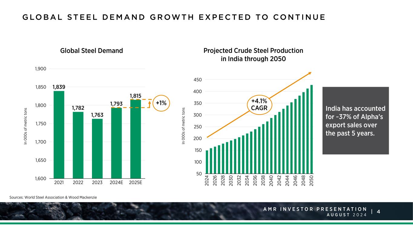 3A M R I N V E S T O R P R E S E N T A T I O N A U G U S T 2 0 2 4 | With customers in 25 countries and significant port capacity, Alpha Metallurgical Resources (NYSE: AMR) reliably supplies metallurgical products to the global steel industry. Alpha operates 21 mines and controls approximately 316 million tons of coal reserves and 514 million tons of in situ coal resources. Our metallurgical coal is used in the coke- making process, which ultimately creates the steel that serves as a basis for modern society across the globe. Steel is used in infrastructure like roads, bridges, building construction, vehicles and household appliances. Near-term projections suggest that global demand for coal used to produce high-quality steel is expected to continue surpassing supply.* S A F E LY P R O D U C I N G A C R I T I C A L P R O D U C T F O R B U I L D I N G M O D E R N S O C I E T Y *Source: Wood Mackenzie