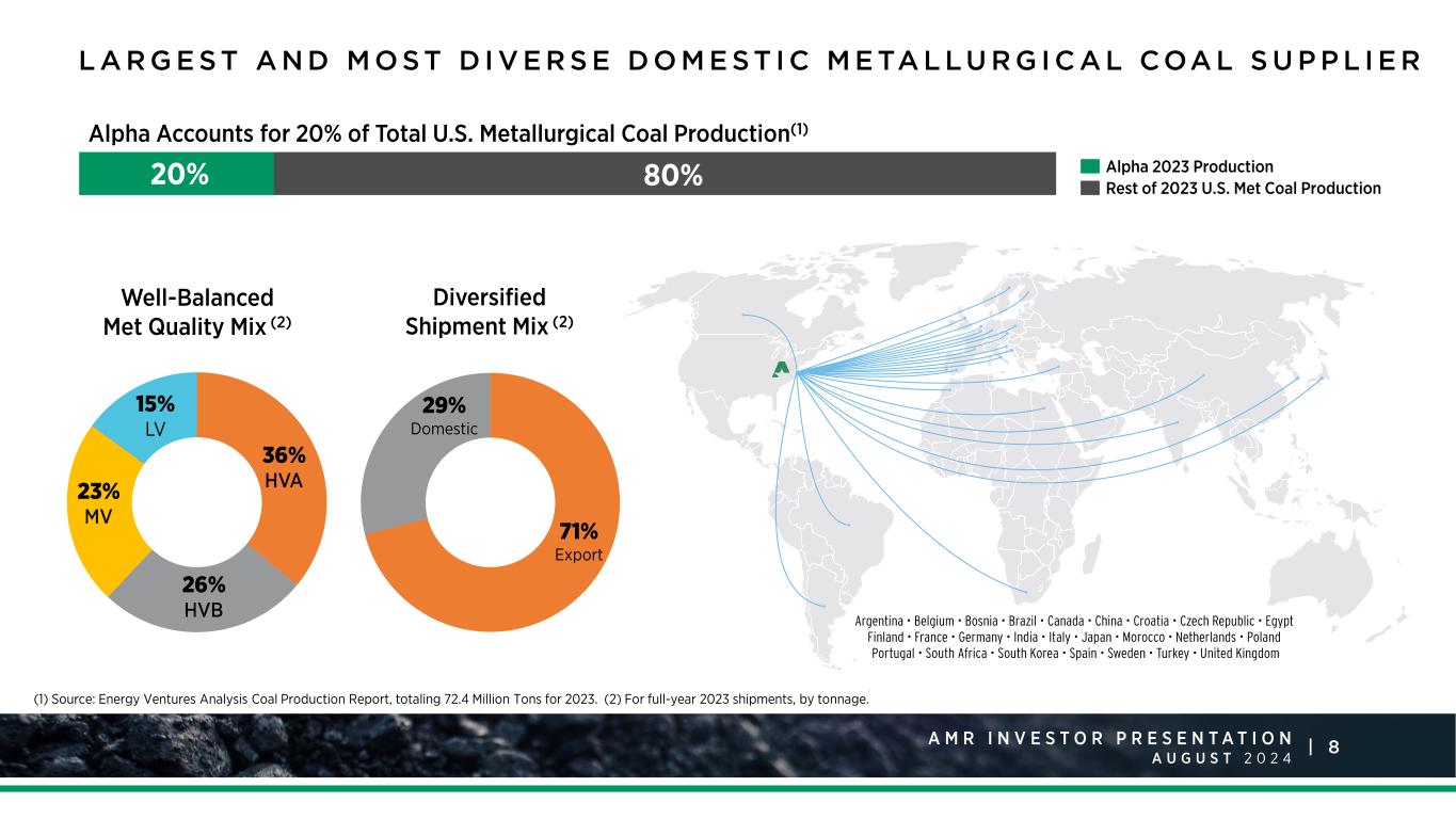 7A M R I N V E S T O R P R E S E N T A T I O N A U G U S T 2 0 2 4 | LARGEST U.S. MET PRODUCER SHAREHOLDER VALUE EXCELLENCE & RELIABILITY LEADERSHIP VISION Accounts for 1/5 of total U.S. met coal production. A diverse portfolio of coal qualities and majority ownership of DTA export facility in Newport News, VA allow for global reach. Demonstrated focus on consistently creating long-term shareholder value. Returning capital to investors exclusively through share repurchases. Industry veterans with the largest, most diverse portfolio of mines. Award-winning performance in safety and environmental stewardship. Known for customer service and reliability. Visionary leadership team with extensive industry experience and commitment to long-term company strength. Focus on creating successful outcomes in the near- term and long-term. FINANCIAL STRENGTH Successfully completed refinancing of our ABL, securing superior terms. Focused on capital projects that support operational excellence, growth and long-term value. A L P H A P O S I T I O N E D TO D E L I V E R LO N G T E R M VA LU E