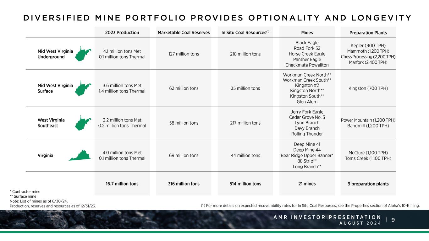 8A M R I N V E S T O R P R E S E N T A T I O N A U G U S T 2 0 2 4 | Alpha Accounts for 20% of Total U.S. Metallurgical Coal Production(1) Well-Balanced Met Quality Mix (2) 36% HVA 26% HVB 23% MV 15% LV Diversified Shipment Mix (2) 20% 80% (1) Source: Energy Ventures Analysis Coal Production Report, totaling 72.4 Million Tons for 2023. (2) For full-year 2023 shipments, by tonnage. 71% Export 29% Domestic Alpha 2023 Production Rest of 2023 U.S. Met Coal Production L A R G E S T A N D M O S T D I V E R S E D O M E S T I C M E TA L LU R G I C A L COA L S U P P L I E R