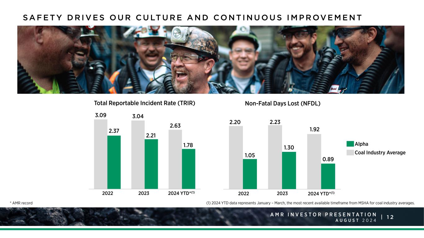 1 2A M R I N V E S T O R P R E S E N T A T I O N A U G U S T 2 0 2 4 | 3.09 3.04 2.63 2.37 2.21 1.78 2022 2023 2024 YTD*(1) Coal Industry Average Total Reportable Incident Rate (TRIR) 2.20 2.23 1.92 1.05 1.30 0.89 2022 2023 2024 YTD*(1) Non-Fatal Days Lost (NFDL) S A F E T Y D R I V E S O U R C U LT U R E A N D CO N T I N U O U S I M P R OV E M E N T Alpha * AMR record (1) 2024 YTD data represents January – March, the most recent available timeframe from MSHA for coal industry averages.