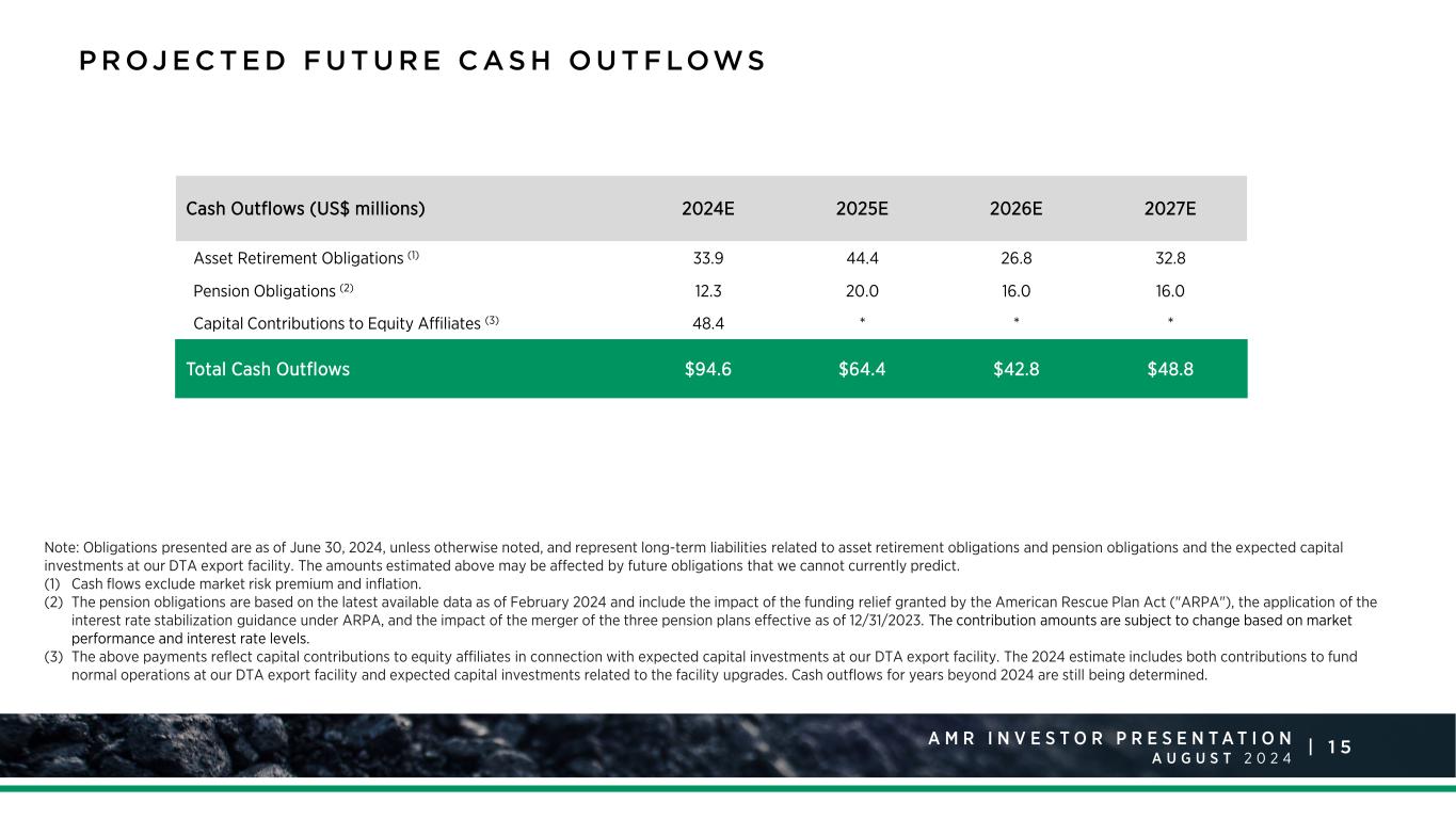 1 5A M R I N V E S T O R P R E S E N T A T I O N A U G U S T 2 0 2 4 | P R OJ E C T E D F U T U R E C AS H O U T F LOWS Cash Outflows (US$ millions) 2024E 2025E 2026E 2027E Asset Retirement Obligations (1) 33.9 44.4 26.8 32.8 Pension Obligations (2) 12.3 20.0 16.0 16.0 Capital Contributions to Equity Affiliates (3) 48.4 * * * Total Cash Outflows $94.6 $64.4 $42.8 $48.8 Note: Obligations presented are as of June 30, 2024, unless otherwise noted, and represent long-term liabilities related to asset retirement obligations and pension obligations and the expected capital investments at our DTA export facility. The amounts estimated above may be affected by future obligations that we cannot currently predict. (1) Cash flows exclude market risk premium and inflation. (2) The pension obligations are based on the latest available data as of February 2024 and include the impact of the funding relief granted by the American Rescue Plan Act ("ARPA"), the application of the interest rate stabilization guidance under ARPA, and the impact of the merger of the three pension plans effective as of 12/31/2023. The contribution amounts are subject to change based on market performance and interest rate levels. (3) The above payments reflect capital contributions to equity affiliates in connection with expected capital investments at our DTA export facility. The 2024 estimate includes both contributions to fund normal operations at our DTA export facility and expected capital investments related to the facility upgrades. Cash outflows for years beyond 2024 are still being determined.
