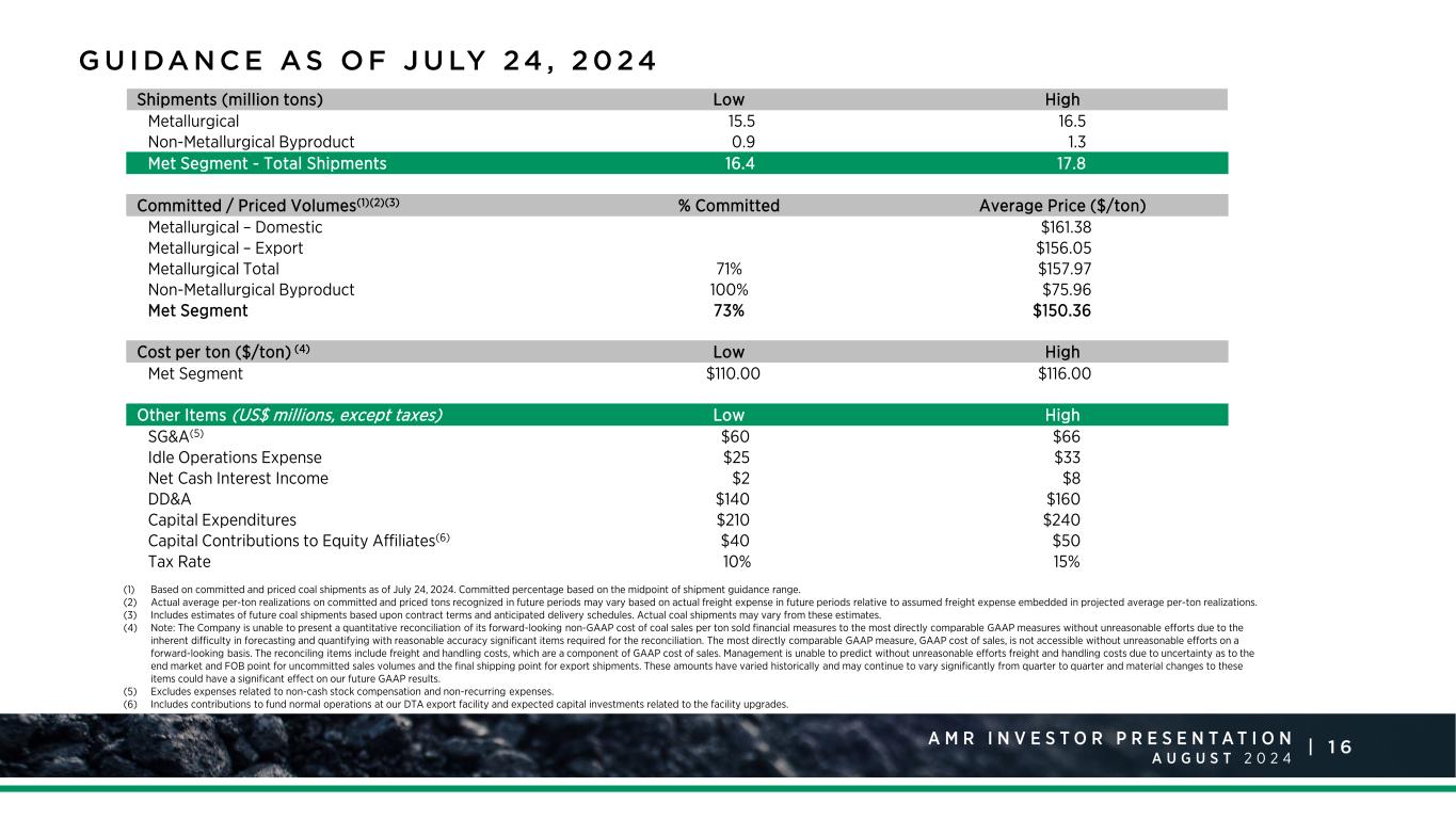 1 6A M R I N V E S T O R P R E S E N T A T I O N A U G U S T 2 0 2 4 | (1) Based on committed and priced coal shipments as of July 24, 2024. Committed percentage based on the midpoint of shipment guidance range. (2) Actual average per-ton realizations on committed and priced tons recognized in future periods may vary based on actual freight expense in future periods relative to assumed freight expense embedded in projected average per-ton realizations. (3) Includes estimates of future coal shipments based upon contract terms and anticipated delivery schedules. Actual coal shipments may vary from these estimates. (4) Note: The Company is unable to present a quantitative reconciliation of its forward-looking non-GAAP cost of coal sales per ton sold financial measures to the most directly comparable GAAP measures without unreasonable efforts due to the inherent difficulty in forecasting and quantifying with reasonable accuracy significant items required for the reconciliation. The most directly comparable GAAP measure, GAAP cost of sales, is not accessible without unreasonable efforts on a forward-looking basis. The reconciling items include freight and handling costs, which are a component of GAAP cost of sales. Management is unable to predict without unreasonable efforts freight and handling costs due to uncertainty as to the end market and FOB point for uncommitted sales volumes and the final shipping point for export shipments. These amounts have varied historically and may continue to vary significantly from quarter to quarter and material changes to these items could have a significant effect on our future GAAP results. (5) Excludes expenses related to non-cash stock compensation and non-recurring expenses. (6) Includes contributions to fund normal operations at our DTA export facility and expected capital investments related to the facility upgrades. G U I DA N C E A S O F J U LY 24 , 2 0 24 Shipments (million tons) Low High Metallurgical 15.5 16.5 Non-Metallurgical Byproduct 0.9 1.3 Met Segment - Total Shipments 16.4 17.8 Committed / Priced Volumes(1)(2)(3) % Committed Average Price ($/ton) Metallurgical – Domestic $161.38 Metallurgical – Export $156.05 Metallurgical Total 71% $157.97 Non-Metallurgical Byproduct 100% $75.96 Met Segment 73% $150.36 Cost per ton ($/ton) (4) Low High Met Segment $110.00 $116.00 Other Items (US$ millions, except taxes) Low High SG&A(5) $60 $66 Idle Operations Expense $25 $33 Net Cash Interest Income $2 $8 DD&A $140 $160 Capital Expenditures $210 $240 Capital Contributions to Equity Affiliates(6) $40 $50 Tax Rate 10% 15%