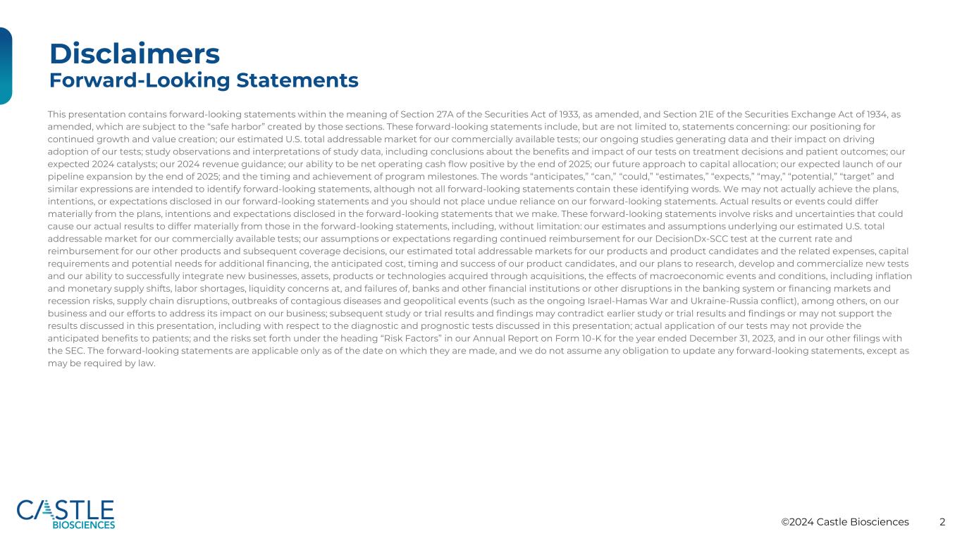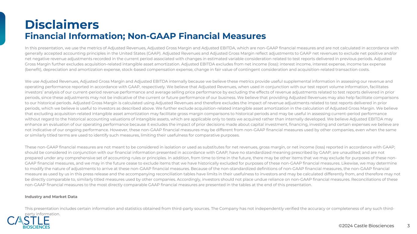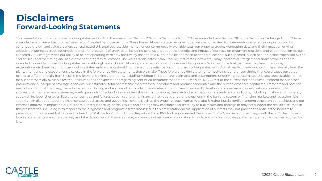 ©2024 Castle Biosciences 2 Disclaimers Forward-Looking Statements This presentation contains forward-looking statements within the meaning of Section 27A of the Securities Act of 1933, as amended, and Section 21E of the Securities Exchange Act of 1934, as amended, which are subject to the “safe harbor” created by those sections. These forward-looking statements include, but are not limited to, statements concerning: our positioning for continued growth and value creation; our estimated U.S. total addressable market for our commercially available tests; our ongoing studies generating data and their impact on driving adoption of our tests; study observations and interpretations of study data, including conclusions about the benefits and impact of our tests on treatment decisions and patient outcomes; our expected 2024 catalysts; and our ability to be net operating cash flow positive by the end of 2025; our future approach to capital allocation; our expected launch of our pipeline expansion by the end of 2025; and the timing and achievement of program milestones. The words “anticipates,” “can,” “could,” “estimates,” “expects,” “may,” “potential,” “target” and similar expressions are intended to identify forward-looking statements, although not all forward-looking statements contain these identifying words. We may not actually achieve the plans, intentions, or expectations disclosed in our forward-looking statements and you should not place undue reliance on our forward-looking statements. Actual results or events could differ materially from the plans, intentions and expectations disclosed in the forward-looking statements that we make. These forward-looking statements involve risks and uncertainties that could cause our actual results to differ materially from those in the forward-looking statements, including, without limitation: our estimates and assumptions underlying our estimated U.S. total addressable market for our commercially available tests; our assumptions or expectations regarding continued reimbursement for our DecisionDx-SCC test at the current rate and reimbursement for our other products and subsequent coverage decisions, our estimated total addressable markets for our products and product candidates and the related expenses, capital requirements and potential needs for additional financing, the anticipated cost, timing and success of our product candidates, and our plans to research, develop and commercialize new tests and our ability to successfully integrate new businesses, assets, products or technologies acquired through acquisitions, the effects of macroeconomic events and conditions, including inflation and monetary supply shifts, labor shortages, liquidity concerns at, and failures of, banks and other financial institutions or other disruptions in the banking system or financing markets and recession risks, supply chain disruptions, outbreaks of contagious diseases and geopolitical events (such as the ongoing Israel-Hamas War and Ukraine-Russia conflict), among others, on our business and our efforts to address its impact on our business; subsequent study or trial results and findings may contradict earlier study or trial results and findings or may not support the results discussed in this presentation, including with respect to the diagnostic and prognostic tests discussed in this presentation; actual application of our tests may not provide the anticipated benefits to patients; and the risks set forth under the heading “Risk Factors” in our Annual Report on Form 10-K for the year ended December 31, 2023, and in our other filings with the SEC. The forward- looking statements are applicable only as of the date on which they are made, and we do not assume any obligation to update any forward-looking statements, except as may be required by law.