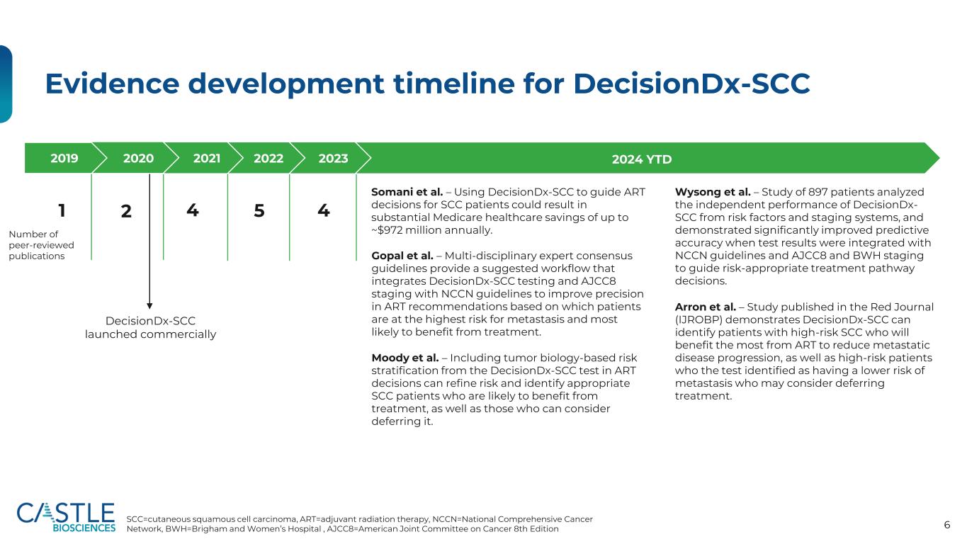 ©2024 Castle Biosciences 5 Key second quarter 2024 results 1 Founder, president and CEO, Derek Maetzold named by Ernst & Young LLP (EY) as an Entrepreneur Of The Year® 2024 Gulf South Award winner 4 Gross Margin for Q2 2024 was 80.7%, and Adjusted Gross Margin was 83.2%, compared to 73.5% and 78.0% respectively in Q2 2023 5 Net cash provided by operations in Q2 2024 was $24.0 million, compared to $3.8 million used in operations in Q2 2023 6 Delivered strong Q2 2024 results, highlighted by year-over- year growth in our total test report volume (+49%) and revenue (+74%) Net income for Q2 2024 was $8.9 million, compared to a net loss of $18.8 million in Q2 2023 7 Published four peer-reviewed studies since the beginning of 2024 demonstrating that DecisionDx-SCC can improve risk stratification when used in conjunction with staging, to help predict responsiveness to adjuvant radiation therapy (ART) and when used in conjunction with clinicopathologic factors in considering use of ART, can potentially lead to net annual Medicare healthcare savings of up to approximately $972 million Raised 2024 total revenue guidance to $275-300 million, up from $255-265 million previously reported2 3 Adjusted Gross Margin is a non-GAAP measure. See non-GAAP reconciliations at the end of this presentation for a reconciliation of Adjusted Gross Margin to its most closely comparable GAAP measure.