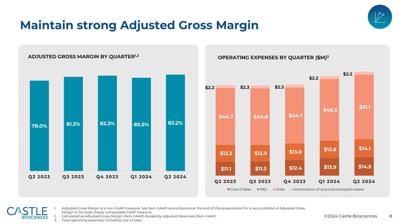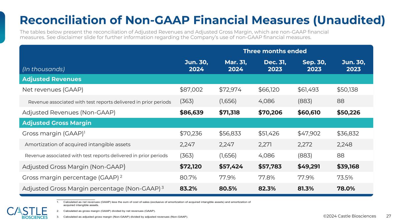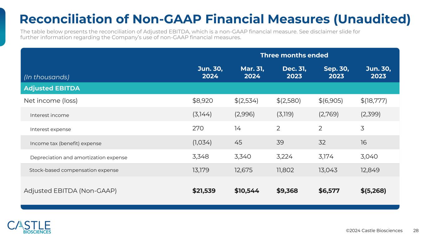 ©2024 Castle Biosciences 27 Reconciliation of Non-GAAP Financial Measures (Unaudited) The tables below present the reconciliation of Adjusted Revenues and Adjusted Gross Margin, which are non-GAAP financial measures. See disclaimer slide for further information regarding the Company’s use of non-GAAP financial measures. (In thousands) Three months ended Jun. 30, 2024 Mar. 31, 2024 Dec. 31, 2023 Sep. 30, 2023 Jun. 30, 2023 Adjusted Revenues Net revenues (GAAP) $87,002 $72,974 $66,120 $61,493 $50,138 Revenue associated with test reports delivered in prior periods (363) (1,656) 4,086 (883) 88 Adjusted Revenues (Non-GAAP) $86,639 $71,318 $70,206 $60,610 $50,226 Adjusted Gross Margin Gross margin (GAAP)1 $70,236 $56,833 $51,426 $47,902 $36,832 Amortization of acquired intangible assets 2,247 2,247 2,271 2,272 2,248 Revenue associated with test reports delivered in prior periods (363) (1,656) 4,086 (883) 88 Adjusted Gross Margin (Non-GAAP) $72,120 $57,424 $57,783 $49,291 $39,168 Gross margin percentage (GAAP) 2 80.7% 77.9% 77.8% 77.9% 73.5% Adjusted Gross Margin percentage (Non-GAAP) 3 83.2% 80.5% 82.3% 81.3% 78.0%
