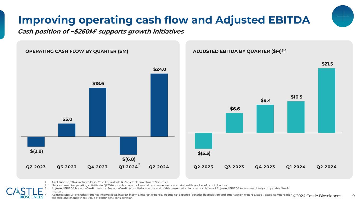 ©2024 Castle Biosciences 8 Maintain strong Adjusted Gross Margin 78.0% 81.3% 82.3% 80.5% 83.2% Q2 2023 Q3 2023 Q4 2023 Q1 2024 Q2 2024 ADJUSTED GROSS MARGIN BY QUARTER1,2 $11.1 $11.3 $12.4 $13.9 $14.5 $13.3 $12.9 $13.0 $13.8 $14.1 $44.7 $44.6 $44.1 $48.5 $51.1 $2.2 $2.2 Q2 2023 Q3 2023 Q4 2023 Q1 2024 Q2 2024 Cost of Sales R&D SG&A Amortization of acquired intangible assets OPERATING EXPENSES BY QUARTER ($M)3 1. Adjusted Gross Margin is a non-GAAP measure. See Non-GAAP reconciliations at the end of this presentation for a reconciliation of Adjusted Gross Margin to its most closely comparable GAAP measure. 2. Calculated as Adjusted Gross Margin (Non-GAAP) divided by Adjusted Revenues (Non-GAAP) 3. Total operating expenses, including cost of sales $2.2 $2.3$2.3