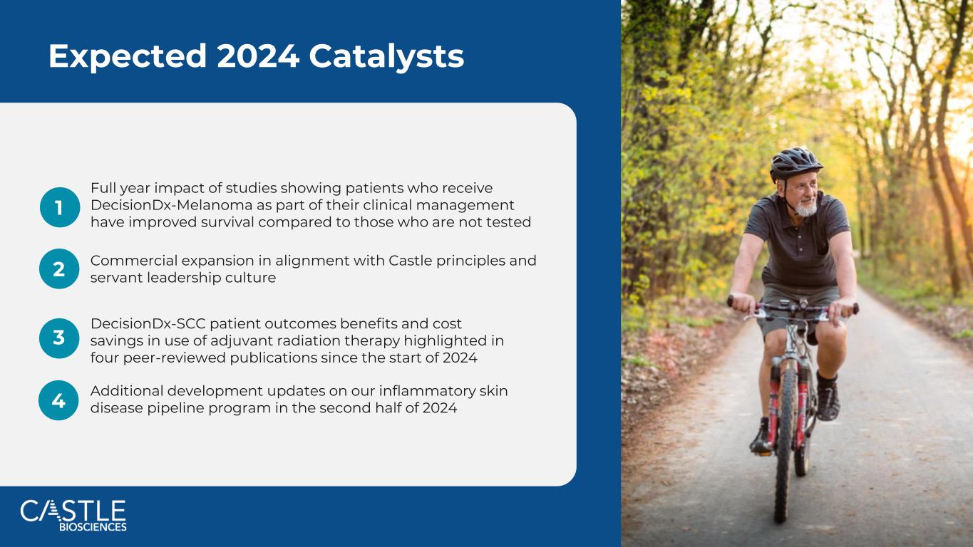 ©2024 Castle Biosciences 2 Disclaimers Forward-Looking Statements This presentation contains forward-looking statements within the meaning of Section 27A of the Securities Act of 1933, as amended, and Section 21E of the Securities Exchange Act of 1934, as amended, which are subject to the “safe harbor” created by those sections. These forward-looking statements include, but are not limited to, statements concerning: our positioning for continued growth and value creation; our estimated U.S. total addressable market for our commercially available tests; our ongoing studies generating data and their impact on driving adoption of our tests; study observations and interpretations of study data, including conclusions about the benefits and impact of our tests on treatment decisions and patient outcomes; our expected 2024 catalysts; our 2024 revenue guidance; our ability to be net operating cash flow positive by the end of 2025; our future approach to capital allocation; our expected launch of our pipeline expansion by the end of 2025; and the timing and achievement of program milestones. The words “anticipates,” “can,” “could,” “estimates,” “expects,” “may,” “potential,” “target” and similar expressions are intended to identify forward-looking statements, although not all forward-looking statements contain these identifying words. We may not actually achieve the plans, intentions, or expectations disclosed in our forward-looking statements and you should not place undue reliance on our forward-looking statements. Actual results or events could differ materially from the plans, intentions and expectations disclosed in the forward-looking statements that we make. These forward-looking statements involve risks and uncertainties that could cause our actual results to differ materially from those in the forward-looking statements, including, without limitation: our estimates and assumptions underlying our estimated U.S. total addressable market for our commercially available tests; our assumptions or expectations regarding continued reimbursement for our DecisionDx-SCC test at the current rate and reimbursement for our other products and subsequent coverage decisions, our estimated total addressable markets for our products and product candidates and the related expenses, capital requirements and potential needs for additional financing, the anticipated cost, timing and success of our product candidates, and our plans to research, develop and commercialize new tests and our ability to successfully integrate new businesses, assets, products or technologies acquired through acquisitions, the effects of macroeconomic events and conditions, including inflation and monetary supply shifts, labor shortages, liquidity concerns at, and failures of, banks and other financial institutions or other disruptions in the banking system or financing markets and recession risks, supply chain disruptions, outbreaks of contagious diseases and geopolitical events (such as the ongoing Israel-Hamas War and Ukraine-Russia conflict), among others, on our business and our efforts to address its impact on our business; subsequent study or trial results and findings may contradict earlier study or trial results and findings or may not support the results discussed in this presentation, including with respect to the diagnostic and prognostic tests discussed in this presentation; actual application of our tests may not provide the anticipated benefits to patients; and the risks set forth under the heading “Risk Factors” in our Annual Report on Form 10-K for the year ended December 31, 2023, and in our other filings with the SEC. The forward-looking statements are applicable only as of the date on which they are made, and we do not assume any obligation to update any forward-looking statements, except as may be required by law.