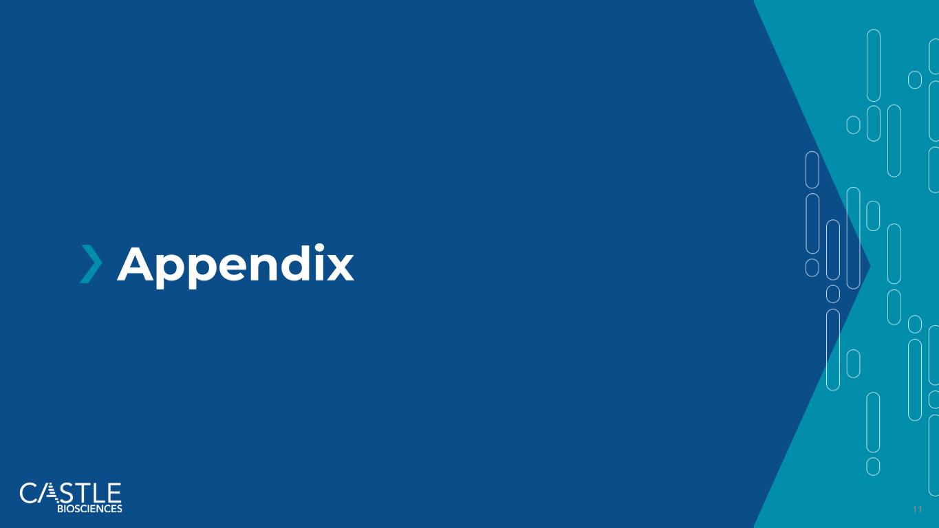 ©2024 Castle Biosciences 10©2024 Castle Biosciences - castlebiosc en es.com Expected 2024 Catalysts 1 2 3 4 Full year impact of studies showing patients who receive DecisionDx-Melanoma as part of their clinical management have improved survival compared to those who are not tested DecisionDx-SCC patient outcomes benefits and cost savings in use of adjuvant radiation therapy highlighted in four peer-reviewed publications since the start of 2024 Additional development updates on our inflammatory skin disease pipeline program in the second half of 2024 Commercial expansion in alignment with Castle principles and servant leadership culture