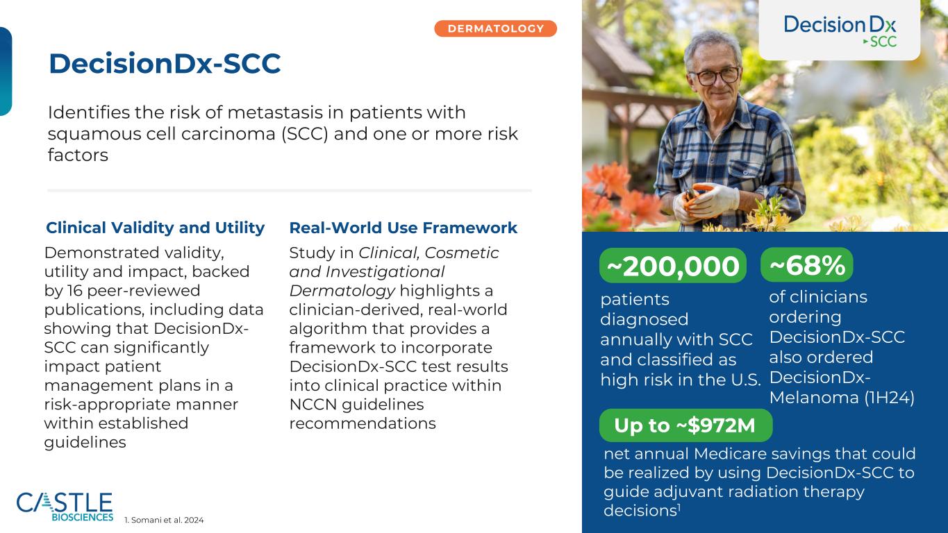 ©2024 Castle Biosciences 13 DecisionDx-SCC DERMATOLOGY Identifies the risk of metastasis in patients with squamous cell carcinoma (SCC) and one or more risk factors Clinical Validity and Utility Demonstrated validity, utility and impact, backed by 16 peer-reviewed publications, including data showing that DecisionDx- SCC can significantly impact patient management plans in a risk-appropriate manner within established guidelines Real-World Use Framework Study in Clinical, Cosmetic and Investigational Dermatology highlights a clinician-derived, real-world algorithm that provides a framework to incorporate DecisionDx-SCC test results into clinical practice within NCCN guidelines recommendations net annual Medicare savings that could be realized by using DecisionDx-SCC to guide adjuvant radiation therapy decisions1 ~200,000 ~68% Up to ~$972M patients diagnosed annually with SCC and classified as high risk in the U.S. of clinicians ordering DecisionDx-SCC also ordered DecisionDx- Melanoma (1H24) 1. Somani et al. 2024