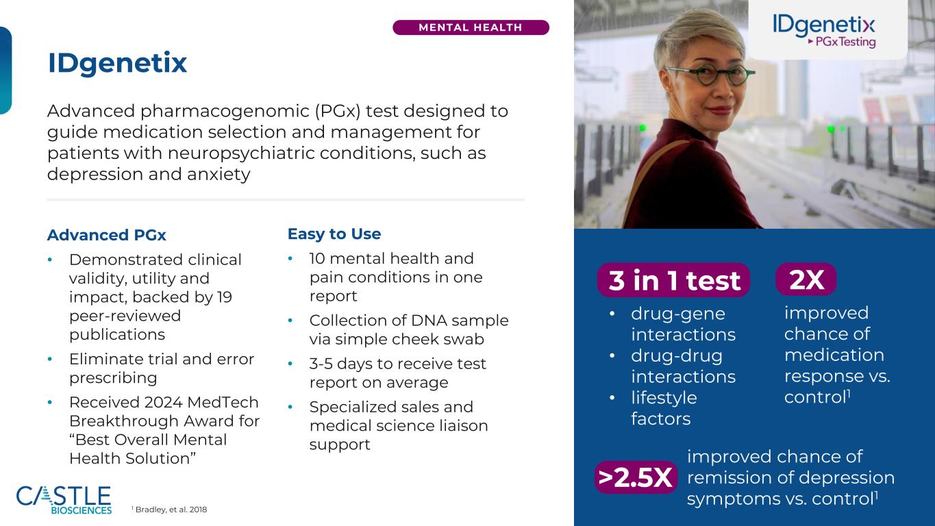 ©2024 Castle Biosciences 24 IDgenetix MENTAL HEALTH Advanced pharmacogenomic (PGx) test designed to guide medication selection and management for patients with neuropsychiatric conditions, such as depression and anxiety Advanced PGx • Demonstrated clinical validity, utility and impact, backed by 19 peer-reviewed publications • Eliminate trial and error prescribing • Received 2024 MedTech Breakthrough Award for “Best Overall Mental Health Solution” Easy to Use • 10 mental health and pain conditions in one report • Collection of DNA sample via simple cheek swab • 3-5 days to receive test report on average • Specialized sales and medical science liaison support improved chance of remission of depression symptoms vs. control1 3 in 1 test • drug-gene interactions • drug-drug interactions • lifestyle factors 2X >2.5X improved chance of medication response vs. control1 1 Bradley, et al. 2018