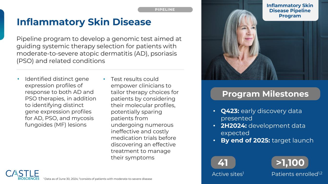 ©2024 Castle Biosciences 23 TissueCypher GASTROENTEROLOGY A leading risk-stratification test designed to predict risk of progression to esophageal cancer in patients with Barrett’s esophagus Clinical Validity and Utility Demonstrated validity, utility and impact, backed by 14 peer-reviewed publications demonstrating the ability and performance of the test in risk-stratifying patients with Barrett’s esophagus to guide risk- appropriate treatment decisions Recognition from AGA 2024 Clinical Practice Guideline acknowledges that individuals who may be at increased risk of progression to esophageal cancer might be identified using tissue-based biomarkers, particularly TissueCypher 2022 Recognized in the Clinical Practice Update on New Technology and Innovation for Surveillance and Screening in Barrett’s Esophagus as a tool that may be used by physicians to risk stratify non-dysplastic patients ~415,000 patients receiving upper GI endoscopies per year who meet intended use criteria for TissueCypher 1 in 40 patients progress to esophageal cancer within 5 years (among BE patients) 14 peer-reviewed publications