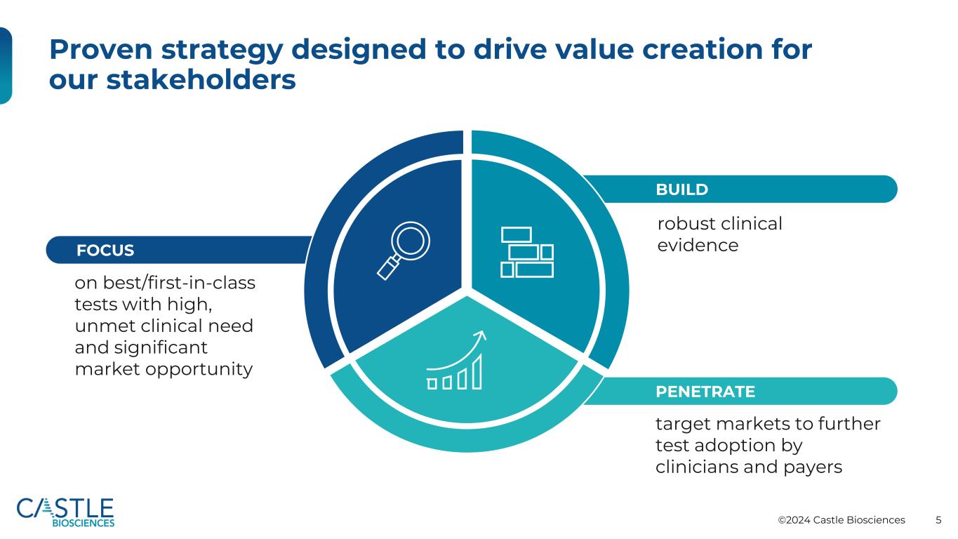 ©2024 Castle Biosciences 4 Proven strategy designed to drive value creation for our stakeholders FOCUS on best/first-in-class tests with high, unmet clinical need and significant market opportunity BUILD robust clinical evidence PENETRATE target markets to further test adoption by clinicians and payers