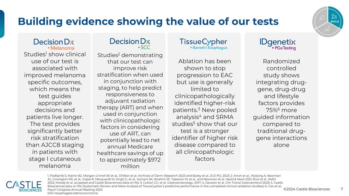 ©2024 Castle Biosciences 6 Estimated ~$8B U.S. total addressable market1 for commercially available tests D E R M A T O LO G Y G A S T R O E N T E R O LO G Y M E N T A L H E A LT H Cutaneous melanoma/ risk of metastasis, SLNB positivity risk ~130K patients classified as Stage I, II, or III2 Cutaneous squamous cell carcinoma/ risk of metastasis ~200K patients with high-risk features2 Suspicious pigmented lesions/ melanoma status ~300K patients with diagnostically ambiguous lesions2 ~$540M TAM ~$820M TAM ~$600M TAM Barrett’s esophagus/ risk of progression to esophageal cancer (EAC) ~415K patients receiving upper GI endoscopies/ year who meet the intended use criteria for TissueCypher3 ~$1B TAM ~$5B TAM Mental health therapy selection Based on indicated use of IDgenetix for patients diagnosed with depression, anxiety, and other mental health conditions FOCUS 1. U.S. TAM = Total addressable market based on estimated patient population assuming average reimbursement rate among all payors. 2. Annual U.S. incidence for Stage I, II or III melanoma estimated at 130,000; annual U.S. incidence for squamous cell carcinoma estimated at 1,000,000 with addressable market limited to carcinomas with one or more high risk features; annual U.S. incidence for suspicious pigmented lesion biopsies estimated at 2,000,000 with addressable market limited to the 15% with an indeterminant biopsy. 3. 415,000 upper GI endoscopies/year with confirmed dx of BE (ND, IND, LGD, excluding HGD).