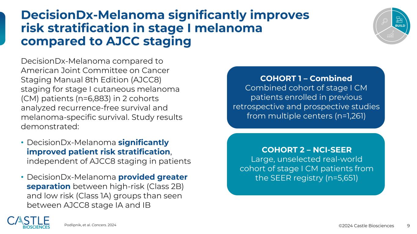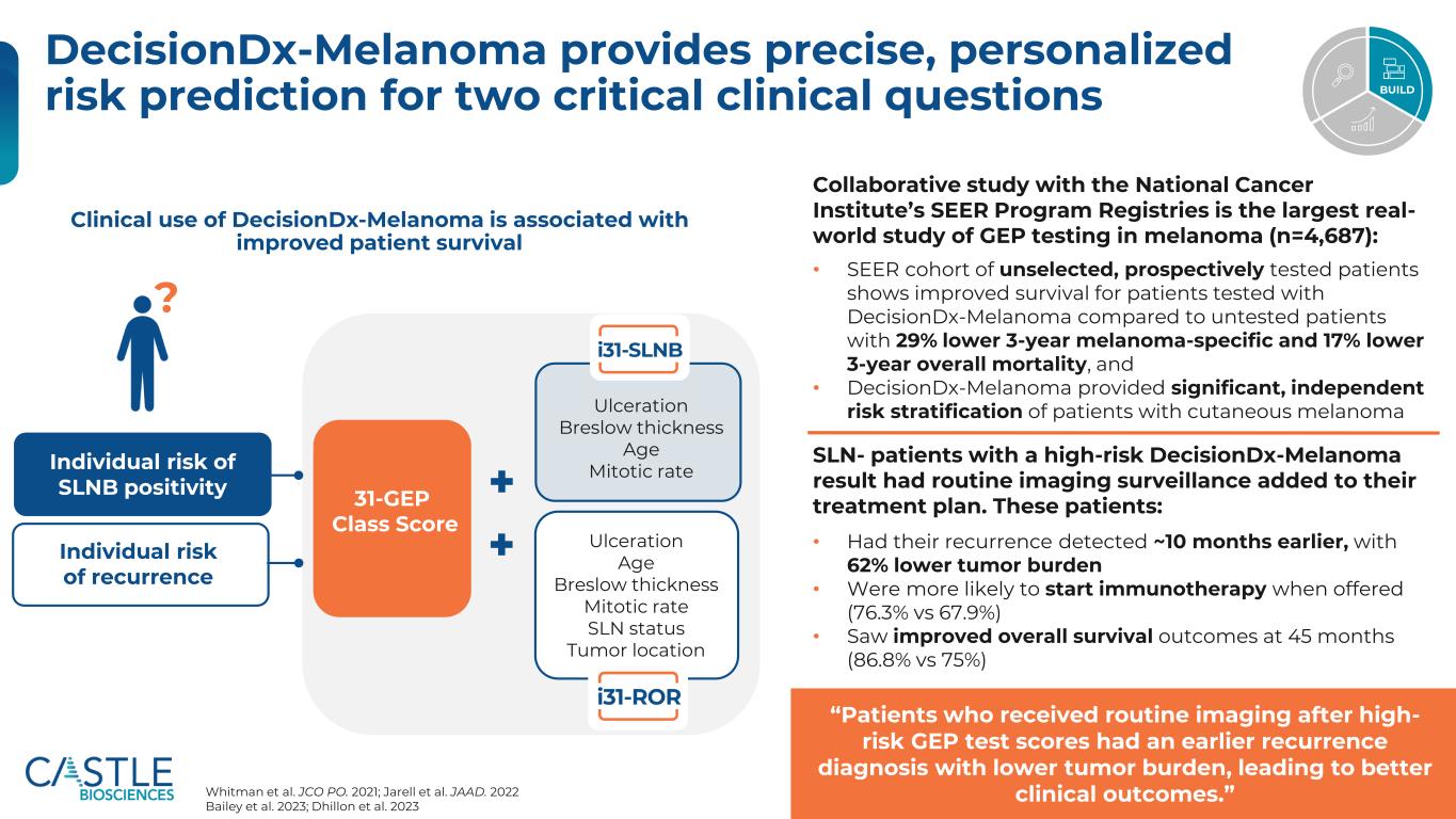©2024 Castle Biosciences 8 Individual risk of SLNB positivity Individual risk of recurrence ? 31-GEP Class Score Ulceration Breslow thickness Age Mitotic rate Ulceration Age Breslow thickness Mitotic rate SLN status Tumor location Collaborative study with the National Cancer Institute’s SEER Program Registries is the largest real- world study of GEP testing in melanoma (n=4,687): • SEER cohort of unselected, prospectively tested patients shows improved survival for patients tested with DecisionDx-Melanoma compared to untested patients with 29% lower 3-year melanoma-specific and 17% lower 3-year overall mortality, and • DecisionDx-Melanoma provided significant, independent risk stratification of patients with cutaneous melanoma SLN- patients with a high-risk DecisionDx-Melanoma result had routine imaging surveillance added to their treatment plan. These patients: • Had their recurrence detected ~10 months earlier, with 62% lower tumor burden • Were more likely to start immunotherapy when offered (76.3% vs 67.9%) • Saw improved overall survival outcomes at 45 months (86.8% vs 75%) Whitman et al. JCO PO. 2021; Jarell et al. JAAD. 2022 Bailey et al. 2023; Dhillon et al. 2023 BUILD “Patients who received routine imaging after high- risk GEP test scores had an earlier recurrence diagnosis with lower tumor burden, leading to better clinical outcomes.” Clinical use of DecisionDx-Melanoma is associated with improved patient survival DecisionDx-Melanoma provides precise, personalized risk prediction for two critical clinical questions