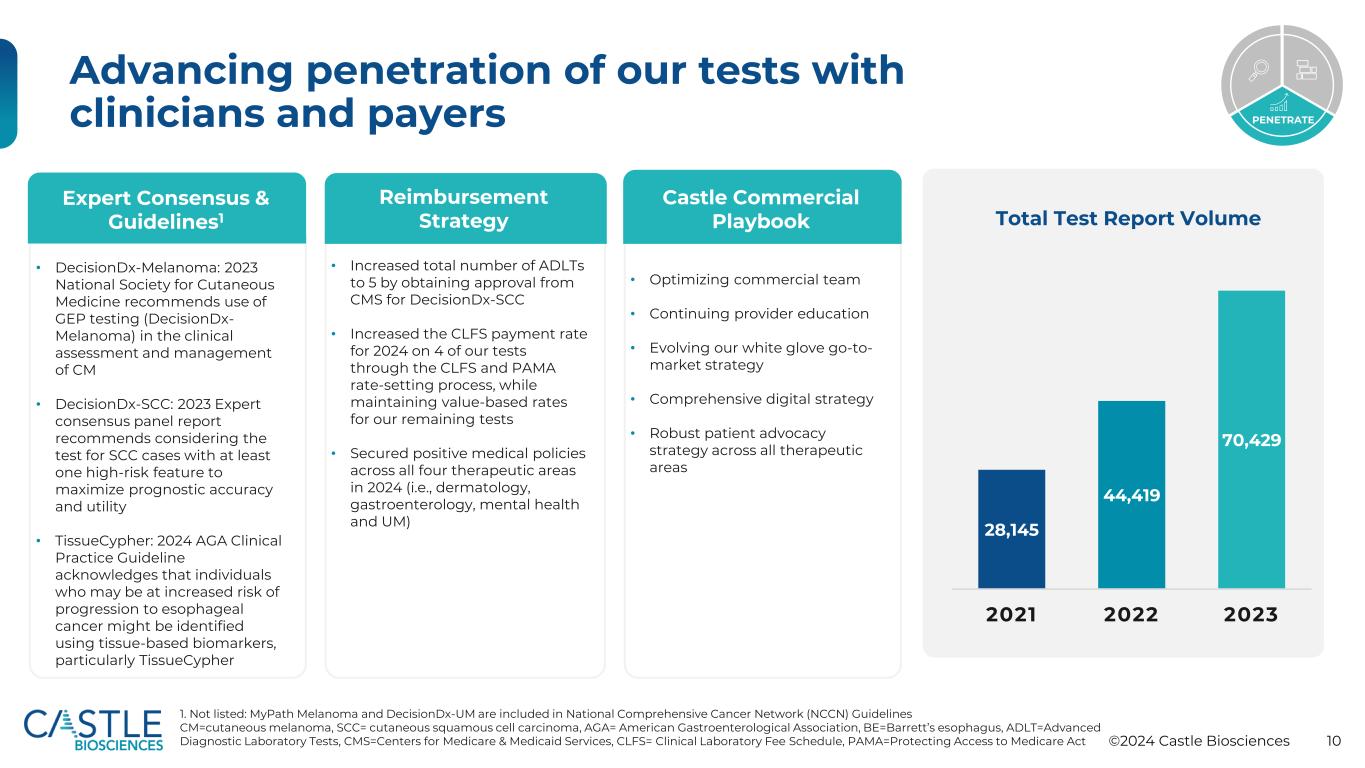 ©2024 Castle Biosciences 10 Advancing penetration of our tests with clinicians and payers Expert Consensus & Guidelines1 Reimbursement Strategy Castle Commercial Playbook PENETRATE 1. Not listed: MyPath Melanoma and DecisionDx-UM are included in National Comprehensive Cancer Network (NCCN) Guidelines CM=cutaneous melanoma, SCC= cutaneous squamous cell carcinoma, AGA= American Gastroenterological Association, BE=Barrett’s esophagus, ADLT=Advanced Diagnostic Laboratory Tests, CMS=Centers for Medicare & Medicaid Services, CLFS= Clinical Laboratory Fee Schedule, PAMA=Protecting Access to Medicare Act • DecisionDx-Melanoma: 2023 National Society for Cutaneous Medicine recommends use of GEP testing (DecisionDx- Melanoma) in the clinical assessment and management of CM • DecisionDx-SCC: 2023 Expert consensus panel report recommends considering the test for SCC cases with at least one high-risk feature to maximize prognostic accuracy and utility • TissueCypher: 2024 AGA Clinical Practice Guideline acknowledges that individuals who may be at increased risk of progression to esophageal cancer might be identified using tissue-based biomarkers, particularly TissueCypher • Increased total number of ADLTs to 5 by obtaining approval from CMS for DecisionDx-SCC • Increased the CLFS payment rate for 2024 on 4 of our tests through the CLFS and PAMA rate-setting process, while maintaining value-based rates for our remaining tests • Secured positive medical policies across all four therapeutic areas in 2024 (i.e., dermatology, gastroenterology, mental health and UM) • Optimizing commercial team • Continuing provider education • Evolving our white glove go-to- market strategy • Comprehensive digital strategy • Robust patient advocacy strategy across all therapeutic areas 28,145 44,419 70,429 2021 2022 2023 Total Test Report Volume