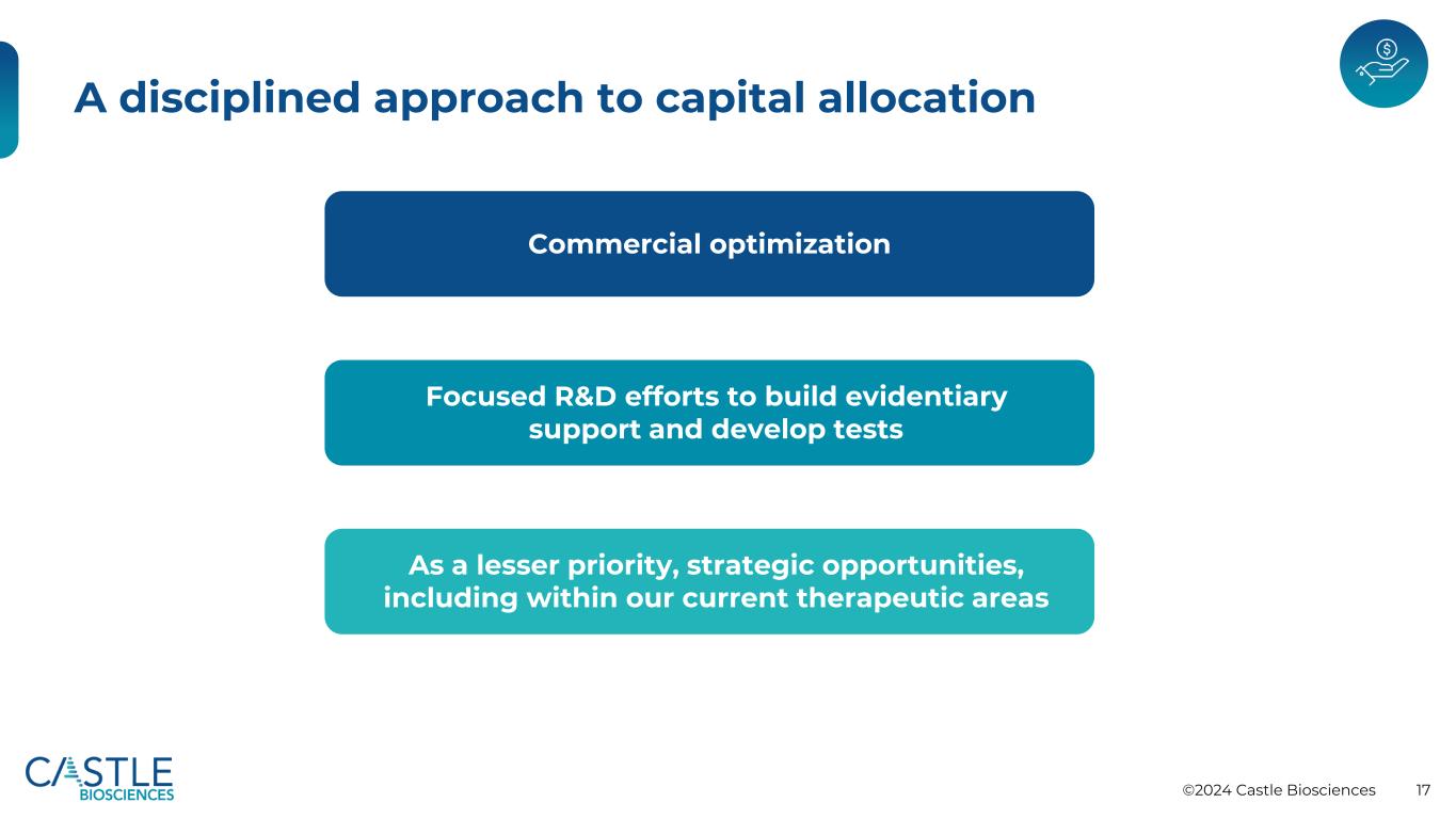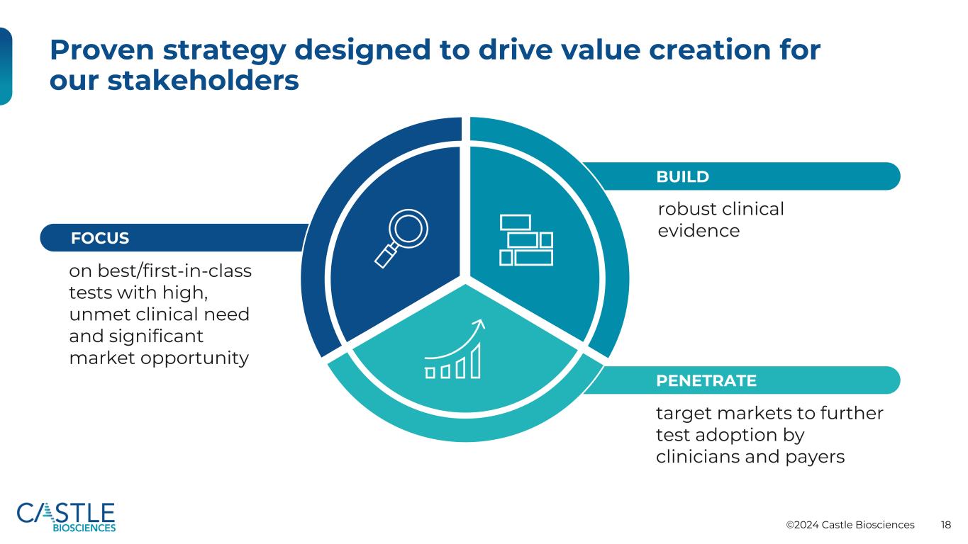 ©2024 Castle Biosciences 17 A disciplined approach to capital allocation Commercial optimization Focused R&D efforts to build evidentiary support and develop tests As a lesser priority, strategic opportunities, including within our current therapeutic areas