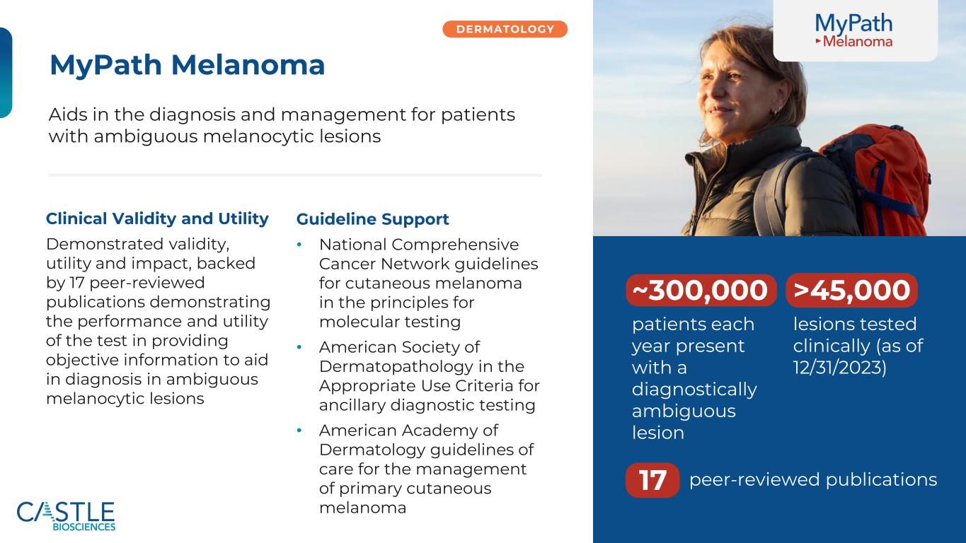 ©2024 Castle Biosciences 22 MyPath Melanoma DERMATOLOGY Aids in the diagnosis and management for patients with ambiguous melanocytic lesions Clinical Validity and Utility Demonstrated validity, utility and impact, backed by 17 peer-reviewed publications demonstrating the performance and utility of the test in providing objective information to aid in diagnosis in ambiguous melanocytic lesions Guideline Support • National Comprehensive Cancer Network guidelines for cutaneous melanoma in the principles for molecular testing • American Society of Dermatopathology in the Appropriate Use Criteria for ancillary diagnostic testing • American Academy of Dermatology guidelines of care for the management of primary cutaneous melanoma peer-reviewed publications ~300,000 patients each year present with a diagnostically ambiguous lesion >45,000 lesions tested clinically (as of 12/31/2023) 17