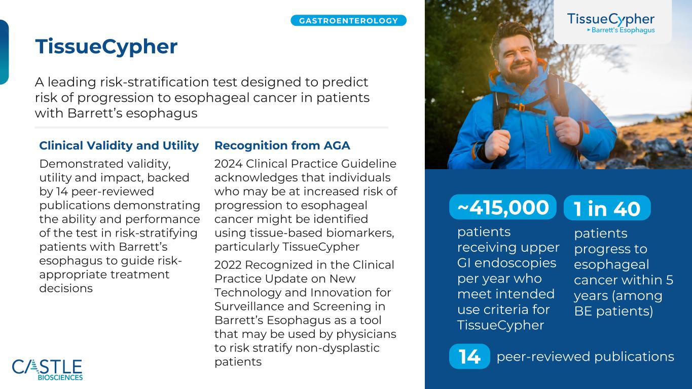 “Regarding our TissueCypher® Barrett’s Esophagus test, the American Gastroenterological Association (AGA) recently recognized in its Clinical Practice Guideline that there is a high-risk subset of non-dysplastic Barrett’s esophagus patients who may benefit from early intervention with endoscopic eradication therapy (EET) and importantly, acknowledged that tissue-based biomarker testing, including the tissue systems pathology test (i.e., TissueCypher, also known as TSP-9) can help identify these patients.