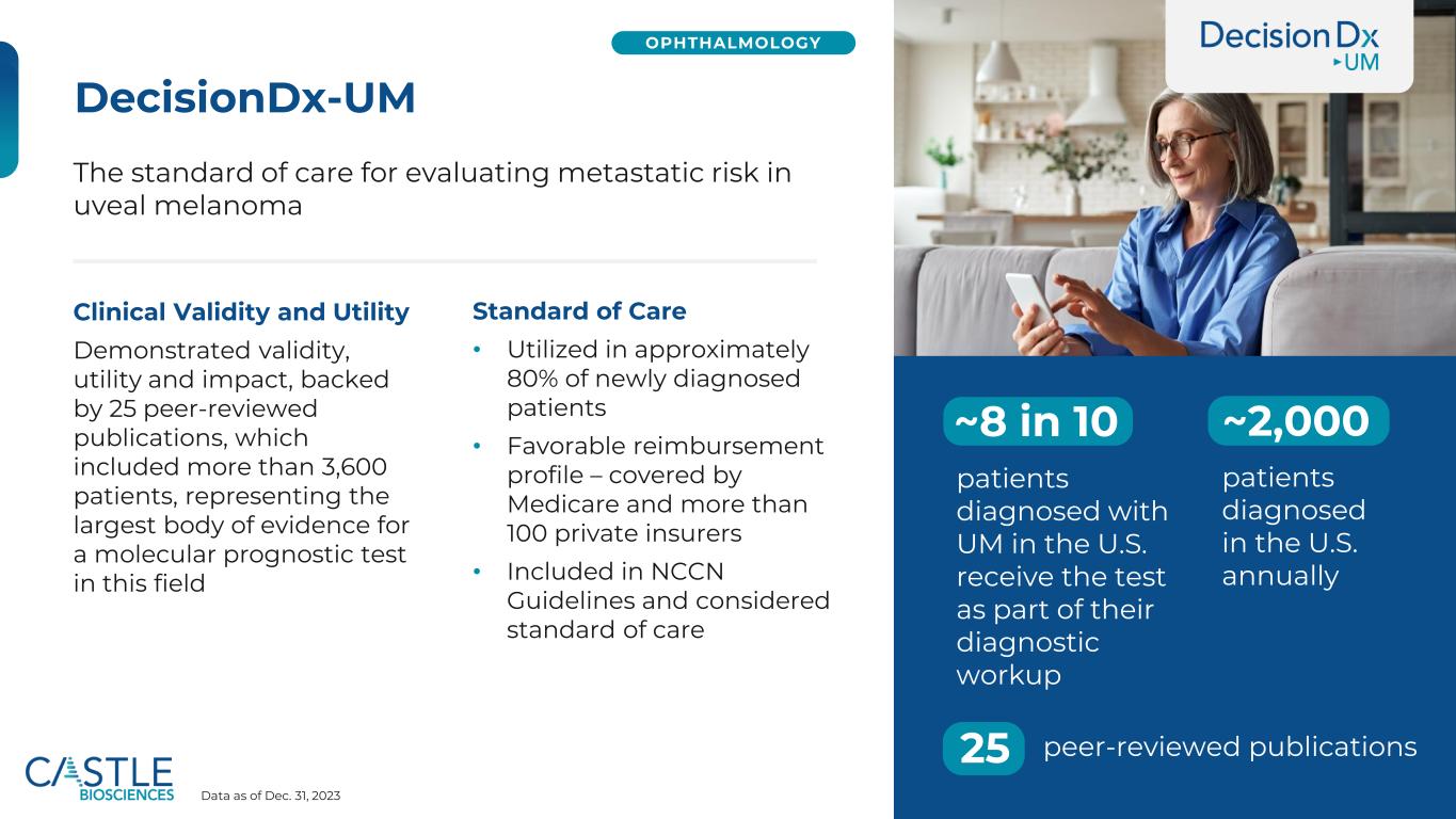 ©2024 Castle Biosciences 25 DecisionDx-UM OPHTHALMOLOGY The standard of care for evaluating metastatic risk in uveal melanoma Standard of Care • Utilized in approximately 80% of newly diagnosed patients • Favorable reimbursement profile – covered by Medicare and more than 100 private insurers • Included in NCCN Guidelines and considered standard of care peer-reviewed publications ~8 in 10 ~2,000 25 patients diagnosed in the U.S. annually patients diagnosed with UM in the U.S. receive the test as part of their diagnostic workup Clinical Validity and Utility Demonstrated validity, utility and impact, backed by 25 peer-reviewed publications, which included more than 3,600 patients, representing the largest body of evidence for a molecular prognostic test in this field Data as of Dec. 31, 2023