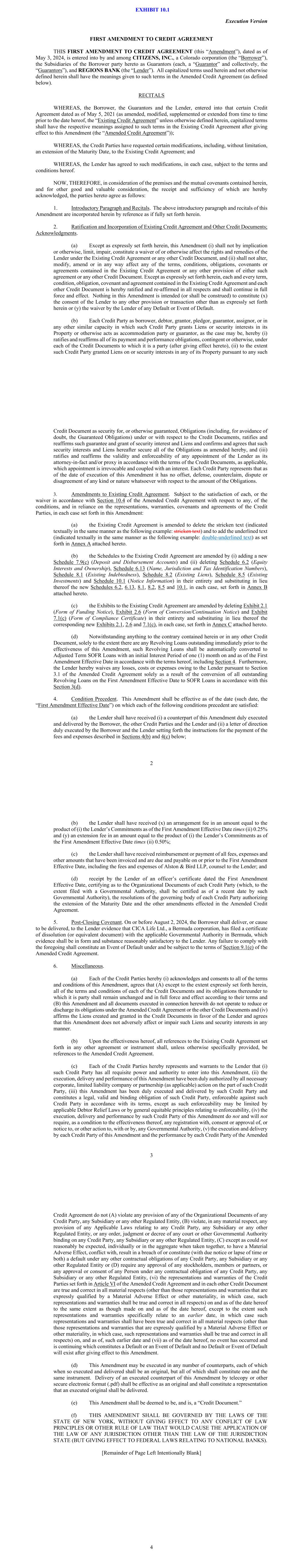 Execution Version FIRST AMENDMENT TO CREDIT AGREEMENT THIS FIRST AMENDMENT TO CREDIT AGREEMENT (this “Amendment”), dated as of May 3, 2024, is entered into by and among CITIZENS, INC., a Colorado corporation (the “Borrower”), the Subsidiaries of the Borrower party hereto as Guarantors (each, a “Guarantor” and collectively, the “Guarantors”), and REGIONS BANK (the “Lender”). All capitalized terms used herein and not otherwise defined herein shall have the meanings given to such terms in the Amended Credit Agreement (as defined below). RECITALS WHEREAS, the Borrower, the Guarantors and the Lender, entered into that certain Credit Agreement dated as of May 5, 2021 (as amended, modified, supplemented or extended from time to time prior to the date hereof, the “Existing Credit Agreement” unless otherwise defined herein, capitalized terms shall have the respective meanings assigned to such terms in the Existing Credit Agreement after giving effect to this Amendment (the “Amended Credit Agreement”)); WHEREAS, the Credit Parties have requested certain modifications, including, without limitation, an extension of the Maturity Date, to the Existing Credit Agreement; and WHEREAS, the Lender has agreed to such modifications, in each case, subject to the terms and conditions hereof. NOW, THEREFORE, in consideration of the premises and the mutual covenants contained herein, and for other good and valuable consideration, the receipt and sufficiency of which are hereby acknowledged, the parties hereto agree as follows: 1. Introductory Paragraph and Recitals. The above introductory paragraph and recitals of this Amendment are incorporated herein by reference as if fully set forth herein. 2. Ratification and Incorporation of Existing Credit Agreement and Other Credit Documents; Acknowledgments. (a) Except as expressly set forth herein, this Amendment (i) shall not by implication or otherwise, limit, impair, constitute a waiver of or otherwise affect the rights and remedies of the Lender under the Existing Credit Agreement or any other Credit Document, and (ii) shall not alter, modify, amend or in any way affect any of the terms, conditions, obligations, covenants or agreements contained in the Existing Credit Agreement or any other provision of either such agreement or any other Credit Document. Except as expressly set forth herein, each and every term, condition, obligation, covenant and agreement contained in the Existing Credit Agreement and each other Credit Document is hereby ratified and re-affirmed in all respects and shall continue in full force and effect. Nothing in this Amendment is intended (or shall be construed) to constitute (x) the consent of the Lender to any other provision or transaction other than as expressly set forth herein or (y) the waiver by the Lender of any Default or Event of Default. (b) Each Credit Party as borrower, debtor, grantor, pledgor, guarantor, assignor, or in any other similar capacity in which such Credit Party grants Liens or security interests in its Property or otherwise acts as accommodation party or guarantor, as the case may be, hereby (i) ratifies and reaffirms all of its payment and performance obligations, contingent or otherwise, under each of the Credit Documents to which it is a party (after giving effect hereto), (ii) to the extent such Credit Party granted Liens on or security interests in any of its Property pursuant to any such EXHIBIT 10.1 2 Credit Document as security for, or otherwise guaranteed, Obligations (including, for avoidance of doubt, the Guaranteed Obligations) under or with respect to the Credit Documents, ratifies and reaffirms such guarantee and grant of security interest and Liens and confirms and agrees that such security interests and Liens hereafter secure all of the Obligations as amended hereby, and (iii) ratifies and reaffirms the validity and enforceability of any appointment of the Lender as its attorney-in-fact and/or proxy in accordance with the terms of the Credit Documents, as applicable, which appointment is irrevocable and coupled with an interest. Each Credit Party represents that as of the date of execution of this Amendment it has no offset, defense, counterclaim, dispute or disagreement of any kind or nature whatsoever with respect to the amount of the Obligations. 3. Amendments to Existing Credit Agreement. Subject to the satisfaction of each, or the waiver in accordance with Section 10.4 of the Amended Credit Agreement with respect to any, of the conditions, and in reliance on the representations, warranties, covenants and agreements of the Credit Parties, in each case set forth in this Amendment: (a) the Existing Credit Agreement is amended to delete the stricken text (indicated textually in the same manner as the following example: stricken text) and to add the underlined text (indicated textually in the same manner as the following example: double-underlined text) as set forth in Annex A attached hereto. (b) the Schedules to the Existing Credit Agreement are amended by (i) adding a new Schedule 7.9(c) (Deposit and Disbursement Accounts) and (ii) deleting Schedule 6.2 (Equity Interests and Ownership), Schedule 6.13 (Name, Jurisdiction and Tax Identification Numbers), Schedule 8.1 (Existing Indebtedness), Schedule 8.2 (Existing Liens), Schedule 8.5 (Existing Investments) and Schedule 10.1 (Notice Information) in their entirety and substituting in lieu thereof the new Schedules 6.2, 6.13, 8.1, 8.2, 8.5 and 10.1, in each case, set forth in Annex B attached hereto. (c) the Exhibits to the Existing Credit Agreement are amended by deleting Exhibit 2.1 (Form of Funding Notice), Exhibit 2.6 (Form of Conversion/Continuation Notice) and Exhibit 7.1(c) (Form of Compliance Certificate) in their entirety and substituting in lieu thereof the corresponding new Exhibits 2.1, 2.6 and 7.1(c), in each case, set forth in Annex C attached hereto. (d) Notwithstanding anything to the contrary contained he