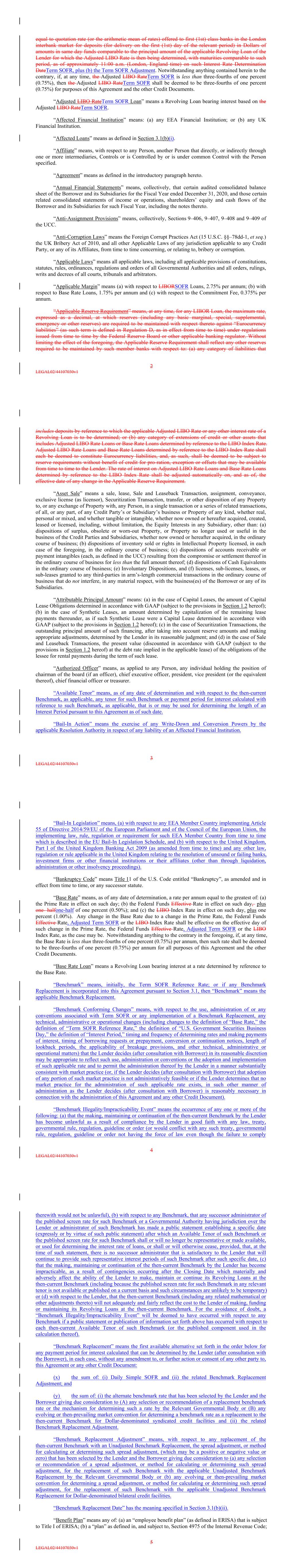 equal to quotation rate (or the arithmetic mean of rates) offered to first (1st) class banks in the London interbank market for deposits (for delivery on the first (1st) day of the relevant period) in Dollars of amounts in same day funds comparable to the principal amount of the applicable Revolving Loan of the Lender for which the Adjusted LIBO Rate is then being determined, with maturities comparable to such period, as of approximately 11:00 a.m. (London, England time) on such Interest Rate Determination DateTerm SOFR, plus (b) the Term SOFR Adjustment. Notwithstanding anything contained herein to the contrary, if, at any time, the Adjusted LIBO RateTerm SOFR is less than three-fourths of one percent (0.75%), then the Adjusted LIBO RateTerm SOFR shall be deemed to be three-fourths of one percent (0.75%) for purposes of this Agreement and the other Credit Documents. “Adjusted LIBO RateTerm SOFR Loan” means a Revolving Loan bearing interest based on the Adjusted LIBO RateTerm SOFR. “Affected Financial Institution” means: (a) any EEA Financial Institution; or (b) any UK Financial Institution. “Affected Loans” means as defined in Section 3.1(b)(i). “Affiliate” means, with respect to any Person, another Person that directly, or indirectly through one or more intermediaries, Controls or is Controlled by or is under common Control with the Person specified. “Agreement” means as defined in the introductory paragraph hereto. “Annual Financial Statements” means, collectively, that certain audited consolidated balance sheet of the Borrower and its Subsidiaries for the Fiscal Year ended December 31, 2020, and those certain related consolidated statements of income or operations, shareholders’ equity and cash flows of the Borrower and its Subsidiaries for such Fiscal Year, including the notes thereto. “Anti-Assignment Provisions” means, collectively, Sections 9–406, 9–407, 9–408 and 9–409 of the UCC. “Anti-Corruption Laws” means the Foreign Corrupt Practices Act (15 U.S.C. §§–78dd-1, et seq.) the UK Bribery Act of 2010, and all other Applicable Laws of any jurisdiction applicable to any Credit Party, or any of its Affiliates, from time to time concerning, or relating to, bribery or corruption. “Applicable Laws” means all applicable laws, including all applicable provisions of constitutions, statutes, rules, ordinances, regulations and orders of all Governmental Authorities and all orders, rulings, writs and decrees of all courts, tribunals and arbitrators. “Applicable Margin” means (a) with respect to LIBORSOFR Loans, 2.75% per annum; (b) with respect to Base Rate Loans, 1.75% per annum and (c) with respect to the Commitment Fee, 0.375% per annum. “Applicable Reserve Requirement” means, at any time, for any LIBOR Loan, the maximum rate, expressed as a decimal, at which reserves (including any basic marginal, special, supplemental, emergency or other reserves) are required to be maintained with respect thereto against “Eurocurrency liabilities” (as such term is defined in Regulation D, as in effect from time to time) under regulations issued from time to time by the Federal Reserve Board or other applicable banking regulator. Without limiting the effect of the foregoing, the Applicable Reserve Requirement shall reflect any other reserves required to be maintained by such member banks with respect to: (a) any category of liabilities that 2 LEGAL02/44107030v1 includes deposits by reference to which the applicable Adjusted LIBO Rate or any other interest rate of a Revolving Loan is to be determined; or (b) any category of extensions of credit or other assets that includes Adjusted LIBO Rate Loans or Base Rate Loans determined by reference to the LIBO Index Rate. Adjusted LIBO Rate Loans and Base Rate Loans determined by reference to the LIBO Index Rate shall each be deemed to constitute Eurocurrency liabilities, and, as such, shall be deemed to be subject to reserve requirements without benefit of credit for pro-ration, exception or offsets that may be available from time to time to the Lender. The rate of interest on Adjusted LIBO Rate Loans and Base Rate Loans determined by reference to the LIBO Index Rate shall be adjusted automatically on, and as of, the effective date of any change in the Applicable Reserve Requirement. “Asset Sale” means a sale, lease, Sale and Leaseback Transaction, assignment, conveyance, exclusive license (as licensor), Securitization Transaction, transfer, or other disposition of any Property to, or any exchange of Property with, any Person, in a single transaction or a series of related transactions, of all, or any part, of any Credit Party’s or Subsidiary’s business or Property of any kind, whether real, personal or mixed, and whether tangible or intangible, whether now owned or hereafter acquired, created, leased or licensed, including, without limitation, the Equity Interests in any Subsidiary, other than: (a) dispositions of surplus, obsolete or worn-out Property, or Property no longer used or useful in the business of the Credit Parties and Subsidiaries, whether now owned or hereafter acquired, in the ordinary course of business; (b) dispositions of inventory sold or rights in Intellectual Property licensed, in each case of the foregoing, in the ordinary course of business; (c) dispositions of accounts receivable or payment intangibles (each, as defined in the UCC) resulting from the compromise or settlement thereof in the ordinary course of business for less than the full amount thereof; (d) dispositions of Cash Equivalents in the ordinary course of business; (e) Involuntary Dispositions, and (f) licenses, sub-licenses, leases, or sub-leases granted to any third-parties in arm’s-length commercial transactions in the ordinary course of business that do not interfere, in any material respect, with the business(es) of the Borrower or any of its Subsidiaries. “Attributable Principal Amount” means: 