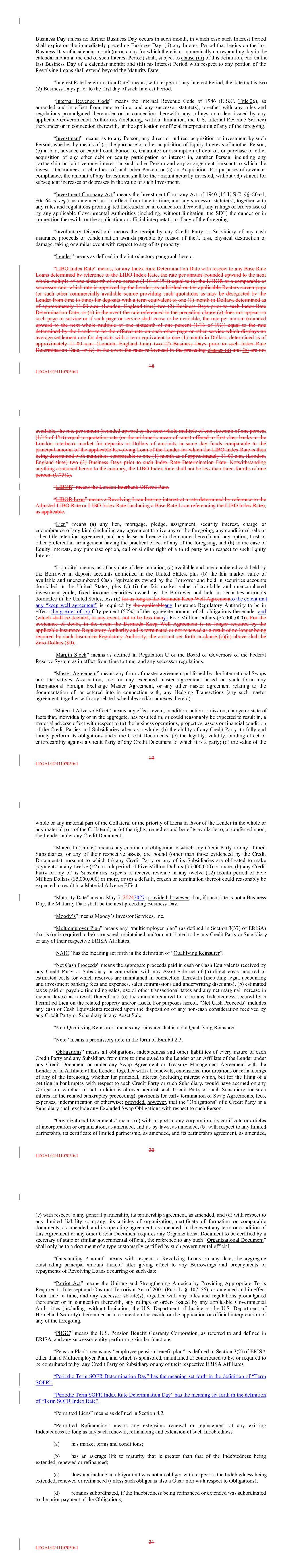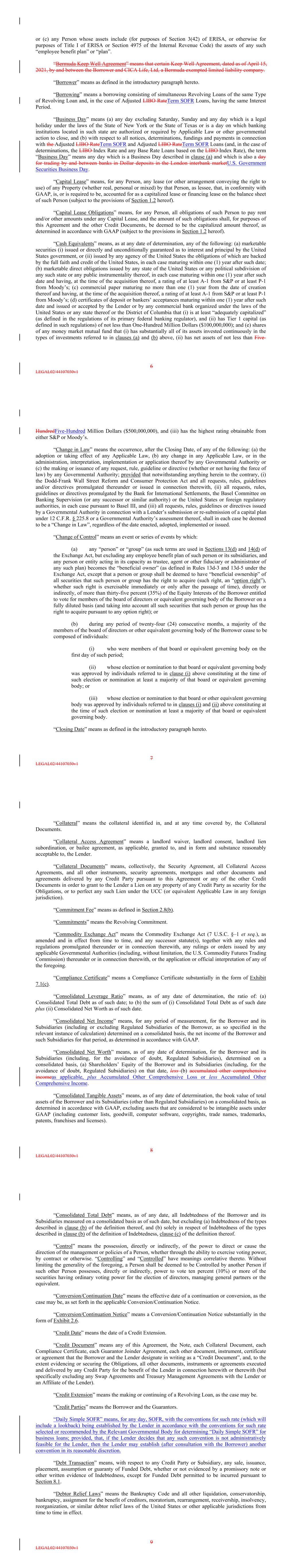 or (c) any Person whose assets include (for purposes of Section 3(42) of ERISA, or otherwise for purposes of Title I of ERISA or Section 4975 of the Internal Revenue Code) the assets of any such “employee benefit plan” or “plan”. “Bermuda Keep Well Agreement” means that certain Keep Well Agreement, dated as of April 15, 2021, by and between the Borrower and CICA Life, Ltd, a Bermuda exempted limited liability company. “Borrower” means as defined in the introductory paragraph hereto. “Borrowing” means a borrowing consisting of simultaneous Revolving Loans of the same Type of Revolving Loan and, in the case of Adjusted LIBO RateTerm SOFR Loans, having the same Interest Period. “Business Day” means (a) any day excluding Saturday, Sunday and any day which is a legal holiday under the laws of the State of New York or the State of Texas or is a day on which banking institutions located in such state are authorized or required by Applicable Law or other governmental action to close, and (b) with respect to all notices, determinations, fundings and payments in connection with the Adjusted LIBO RateTerm SOFR and Adjusted LIBO RateTerm SOFR Loans (and, in the case of determinations, the LIBO Index Rate and any Base Rate Loans based on the LIBO Index Rate), the term “Business Day” means any day which is a Business Day described in clause (a) and which is also a day for trading by and between banks in Dollar deposits in the London interbank marketU.S. Government Securities Business Day. “Capital Lease” means, for any Person, any lease (or other arrangement conveying the right to use) of any Property (whether real, personal or mixed) by that Person, as lessee, that, in conformity with GAAP, is, or is required to be, accounted for as a capitalized lease or financing lease on the balance sheet of such Person (subject to the provisions of Section 1.2 hereof). “Capital Lease Obligations” means, for any Person, all obligations of such Person to pay rent and/or other amounts under any Capital Lease, and the amount of such obligations shall, for purposes of this Agreement and the other Credit Documents, be deemed to be the capitalized amount thereof, as determined in accordance with GAAP (subject to the provisions in Section 1.2 hereof). “Cash Equivalents” means, as at any date of determination, any of the following: (a) marketable securities (i) issued or directly and unconditionally guaranteed as to interest and principal by the United States government, or (ii) issued by any agency of the United States the obligations of which are backed by the full faith and credit of the United States, in each case maturing within one (1) year after such date; (b) marketable direct obligations issued by any state of the United States or any political subdivision of any such state or any public instrumentality thereof, in each case maturing within one (1) year after such date and having, at the time of the acquisition thereof, a rating of at least A-1 from S&P or at least P-1 from Moody’s; (c) commercial paper maturing no more than one (1) year from the date of creation thereof and having, at the time of the acquisition thereof, a rating of at least A-1 from S&P or at least P-1 from Moody’s; (d) certificates of deposit or bankers’ acceptances maturing within one (1) year after such date and issued or accepted by the Lender or by any commercial bank organized under the laws of the United States or any state thereof or the District of Columbia that (i) is at least “adequately capitalized” (as defined in the regulations of its primary federal banking regulator), and (ii) has Tier 1 capital (as defined in such regulations) of not less than One-Hundred Million Dollars ($100,000,000); and (e) shares of any money market mutual fund that (i) has substantially all of its assets invested continuously in the types of investments referred to in clauses (a) and (b) above, (ii) has net assets of not less than Five- 6 LEGAL02/44107030v1 HundredFive-Hundred Million Dollars ($500,000,000), and (iii) has the highest rating obtainable from either S&P or Moody’s. “Change in Law” means the occurrence, after the Closing Date, of any of the following: (a) the adoption or taking effect of any Applicable Law, (b) any change in any Applicable Law, or in the administration, interpretation, implementation or application thereof by any Governmental Authority or (c) the making or issuance of any request, rule, guideline or directive (whether or not having the force of law) by any Governmental Authority; provided that notwithstanding anything herein to the contrary, (i) the Dodd-Frank Wall Street Reform and Consumer Protection Act and all requests, rules, guidelines and/or directives promulgated thereunder or issued in connection therewith, (ii) all requests, rules, guidelines or directives promulgated by the Bank for International Settlements, the Basel Committee on Banking Supervision (or any successor or similar authority) or the United States or foreign regulatory authorities, in each case pursuant to Basel III, and (iii) all requests, rules, guidelines or directives issued by a Governmental Authority in connection with a Lender’s submission or re-submission of a capital plan under 12 C.F.R. § 225.8 or a Governmental Authority’s assessment thereof, shall in each case be deemed to be a “Change in Law”, regardless of the date enacted, adopted, implemented or issued. “Change of Control” means an event or series of events by which: (a) any “person” or “group” (as such terms are used in Sections 13(d) and 14(d) of the Exchange Act, but excluding any employee benefit plan of such person or its subsidiaries, and any person or entity acting in its capacity as trustee, agent or other fiduciary or administrator of any such plan) becomes the “beneficial owner” (as defined in Rules 13d-3 and 13d-5 under the Exchange Act, except that a person or group shall be deemed to have “b